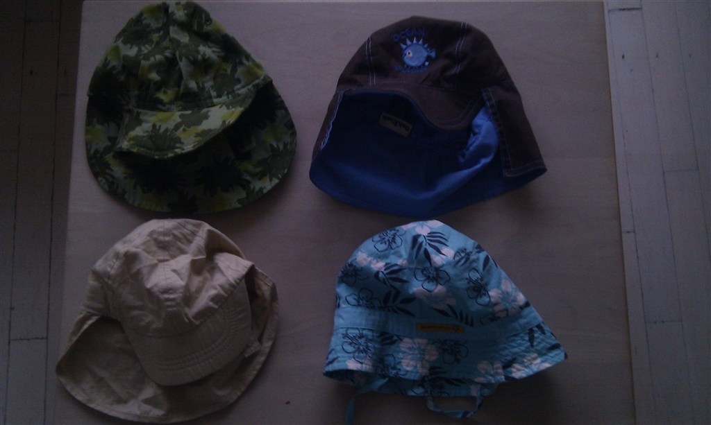 Billede 1: Kasketter: Friends, camouflage, str. 74-86 (9 måneder-1 1/2 år), Osh Kosh, Brun med blå indeni, str. 2-4 år (men er ikke så stor), Coop, beige, str. 74-86 (48 cm), Name it bøllehat, Hawaii style, str. 80-86.