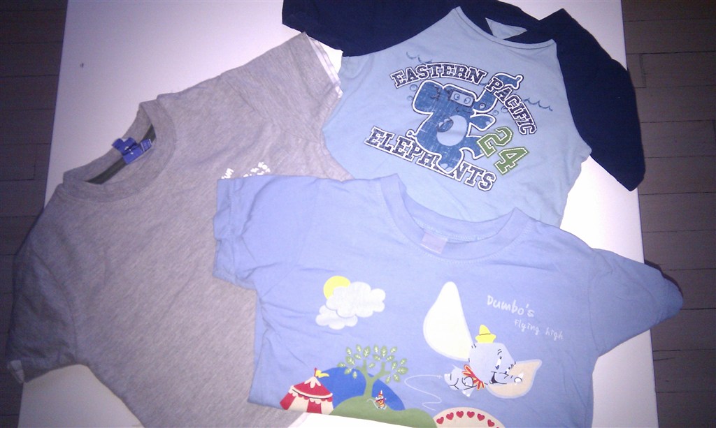 Billede 7: T-shirts, grå str. 18 måneder, blå med elefant, str. 12 måneder, lyseblå med Dumbo, str 2 (men svarer nærmere til en str. 1-1 1/2 år.