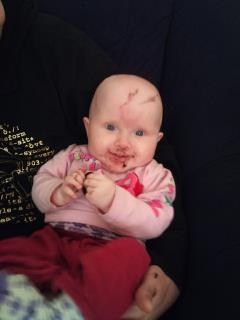 Monica P skriver: Johanne blev 7 måneder igår det skulle da lige fejres med en chokoladekiks, der måtte lige et bad til bagefter :-) men syntes da lige i skal se min lille chokoladebaby
