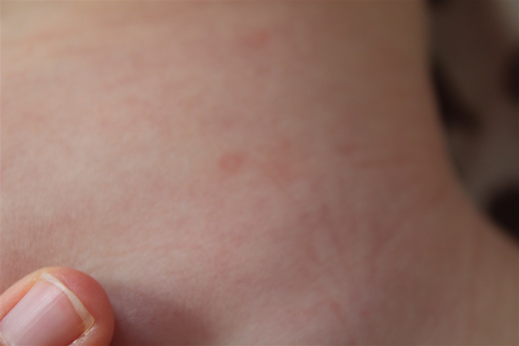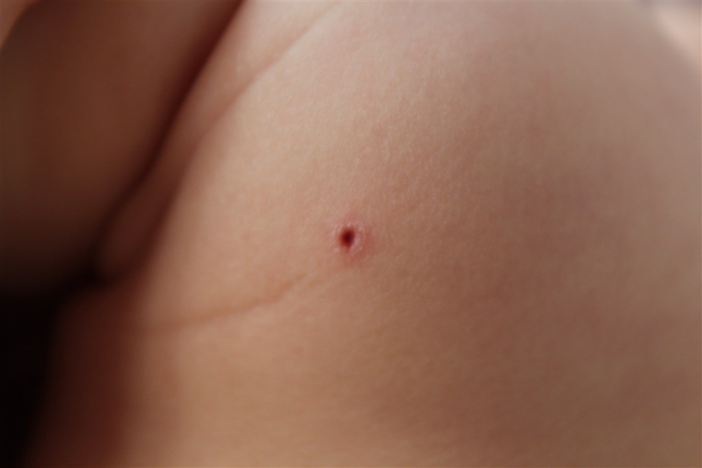 fredag aften opdagede jeg en rød knup i ansigtet på melikka, og troede faktisk det var en 'bums' lign. ting.. og tænkte ike vidre over det.. men lørdag morgen, var det 15-20 i ansigtet og hovedbund.. og da jeg skiftede hende efter middagsluren var de også på mave og lidt på ryggen.. mandag morgen var hun hel fyldt, undtagen hånder og fødder, der først kom onsdag .. og så kom der heller ikke flere.. der er nu kun få skorper tilbage.. heldigvis