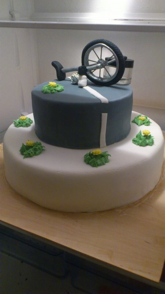 Anyways, efter meget møje og besvær, fik jeg både en et-hjulet cykel, og to runde kager, med nærmest næsten snurrelige kanter, som ikke smeltede og gennemborede fondanten, da denne skulle lægges på