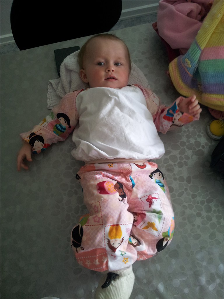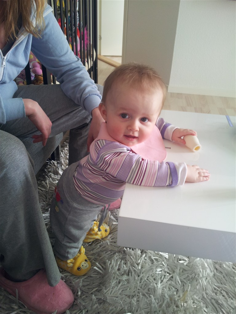 men hun er går med os i hænderne med flot ret ryg. og ellers har hun sin elskede gåstol. som hun racer rundt i. der er godt nok fart på. og kan alt fra at dreje og bakke og det hele