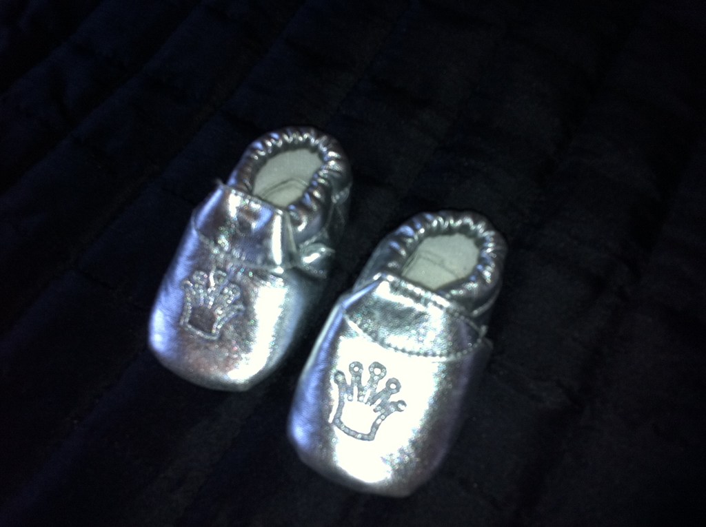 Jeg købte en sød lille sølv skind sko med krone på til min pige, som hun ku bruge som sut sko bagefter.