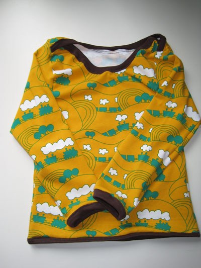 Mette. skriver: Minikreas basismønster er der en t-shirt med lange ærmer, rund hals og eventuelt trykknappen alt efter størrelse.