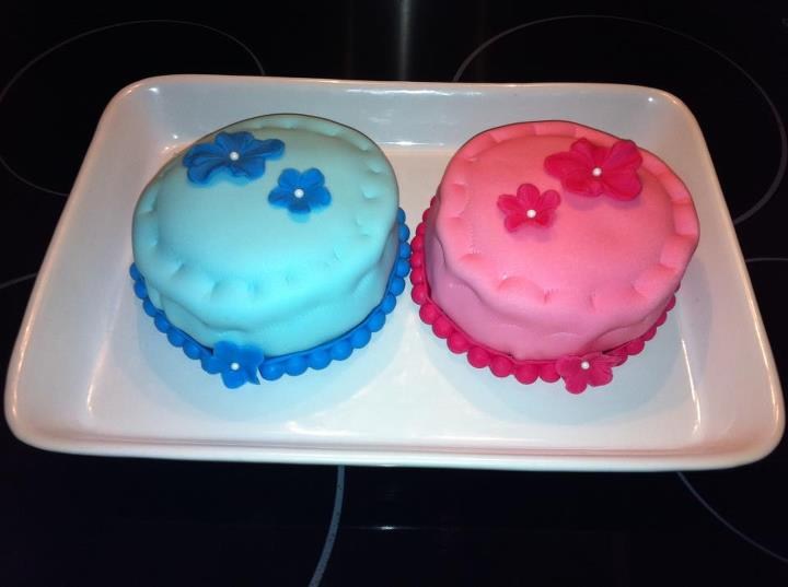 Den ene med toblerone mousse den anden med jordbærmousse, begge smurt op med PSC og pyntet med fondant.