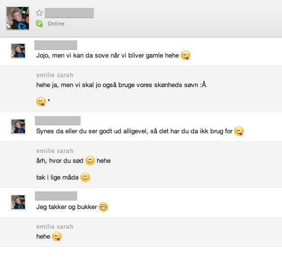 emsaroto skriver: Det gik da meget godt Han er ligeså sød som han var i byen. Han hentede mig halvanden time før filmen startede, også sad vi bare og snakkede indtil filmen begyndte, der var ikke sådan nogle pinlige stille tavsheder så det var da positivt Så kommer vi ind i salen, hvor vi snakker videre og vi griner og ja, hygger bare Filmen starter .. og tror de andre i biografen var trætte af os, for vi snakkede videre godt nok mere stille end før og hovederne meget tættere på hinanden Han dufter virkelig godt! Og han synes også jeg dufter godt hahah Nå filmen slutter og han kører mig hjem .Så havde han ansøgt mig på face og på skype (jeg bruger meget skype). Men ja, så vi skrev lidt i løbet af natten på skype Og i kan lige få lidt af samtalen med ... Hold da op jeg laver mange smileys, det må være fordi jeg er så glad Men det blev sådan lidt ved i løbet af aftenen/natten at han kom med komplimenter, og en ny idé om at, jeg måske igen i aften kunne få min far til at se efter Oskar når han sov. Nu må jeg se