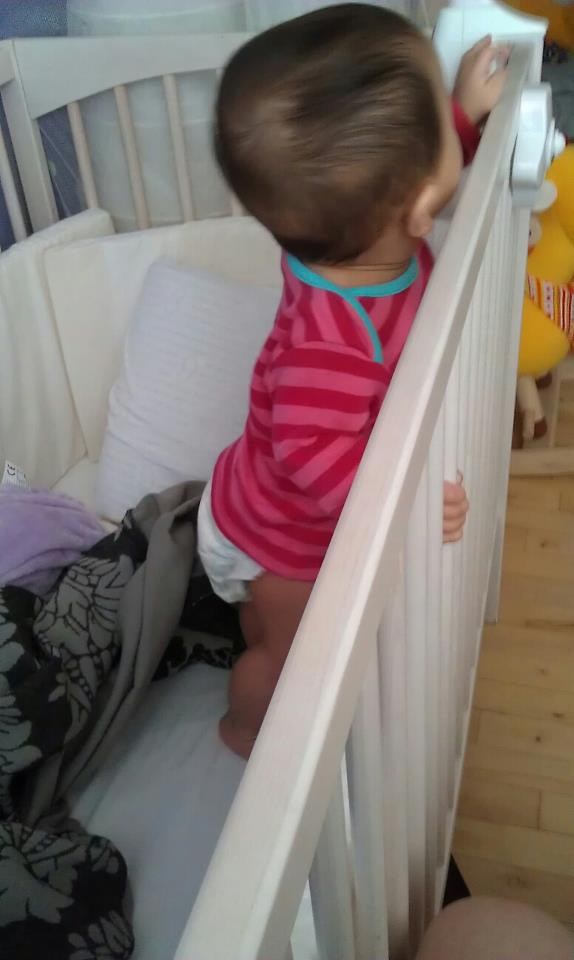 Hun er også begyndt at rejse sig op af ting. Stille og roligt. Hun skal gerne kunne kravle op af det, så hun kan sætte fra med armene, men her til aften rejste hun sig op af tremmerne i tremmesengen på egen hånd. Er hun ikke god???