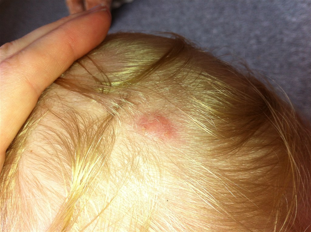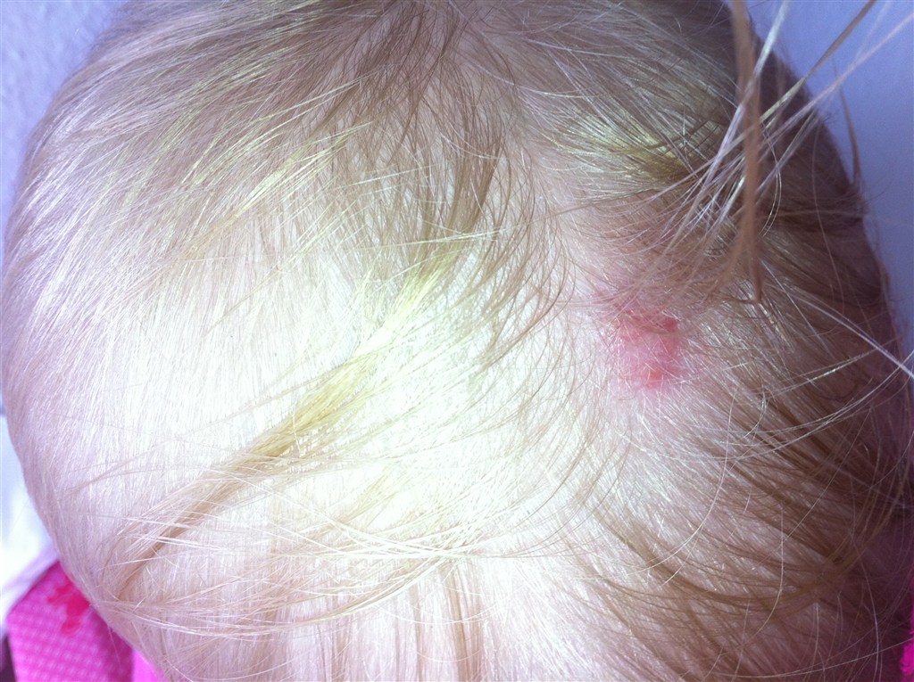 Har i set noget lignende før?? Den er på størrelse med en 25 øre og sidder oppe oven på hovedet lige tæt på "den bløde plet".