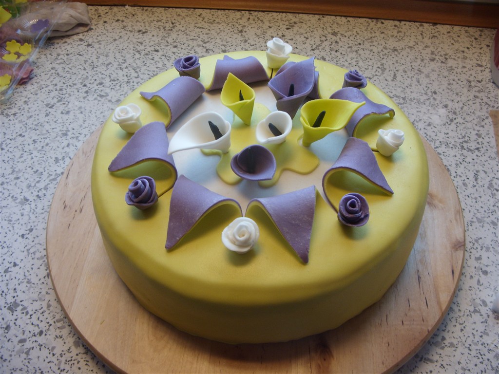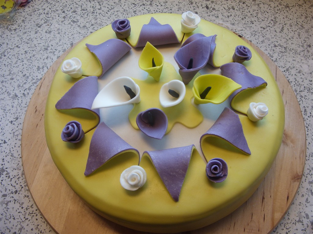 Mellem det hvide lag fondant og det lilla ligger man et stykke bagepapir. Når både det (i dette tilfælde)lilla og limegrønne er lagt på skære man forsigtigt igennem de to lag. Bagepapiret skulle gerne gøre at man ikke skære igennem. Når flapperne er løftet op kan man forsigtigt hive bagepapiret ud.