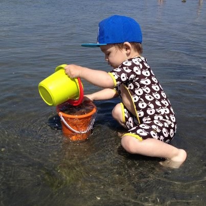 I år har Charlie også været i vandet på strand 2 gange og efter lidt skeptis endte han med at nyde det i fulde drag