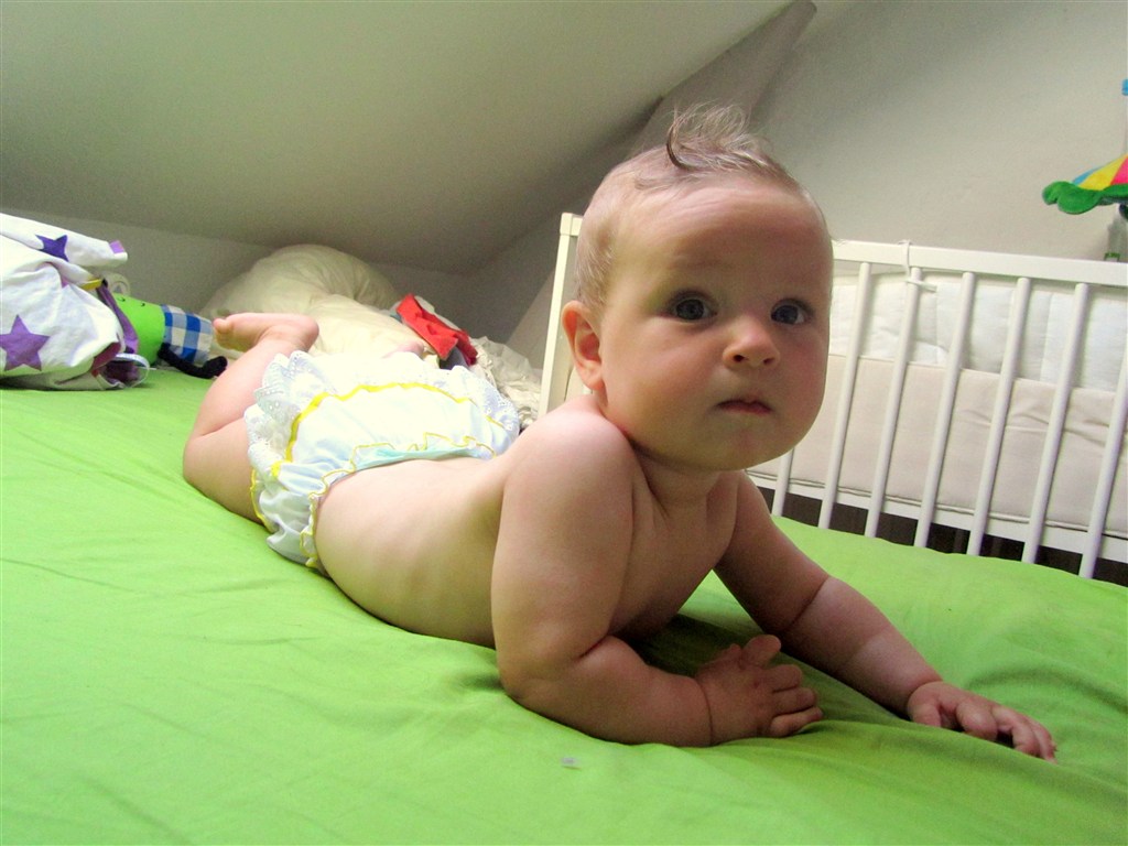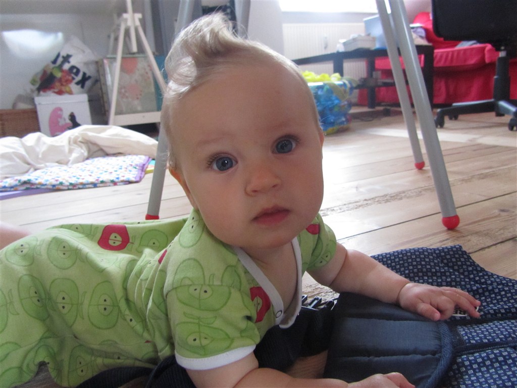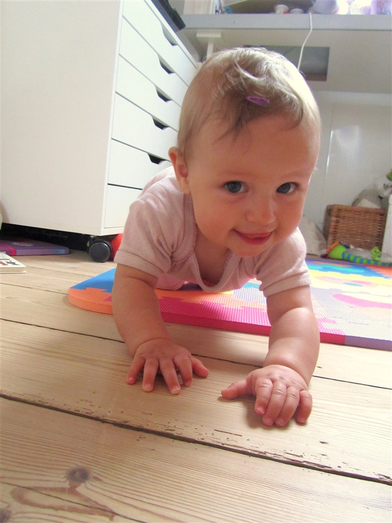 Hun har også på 2 uger lært at sidde selv, komme op på alle 4 og er nu også begyndt at kravle og hive sig op ad ting - ikke noget at sige til at det er hårdt at være baby.