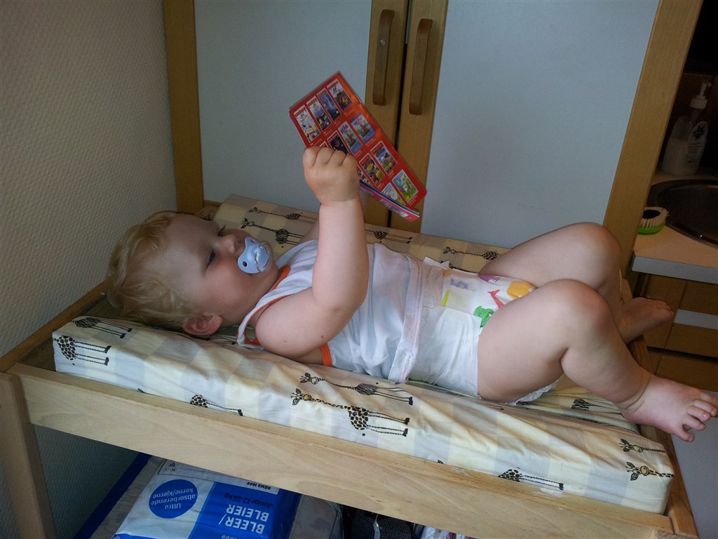 Åh hvor er han sød. Silas "læser" ofte når han bliver skiftet