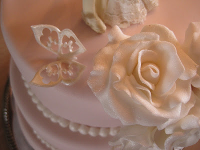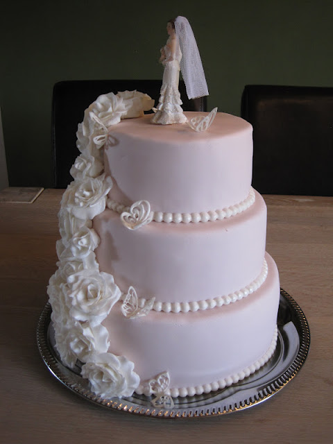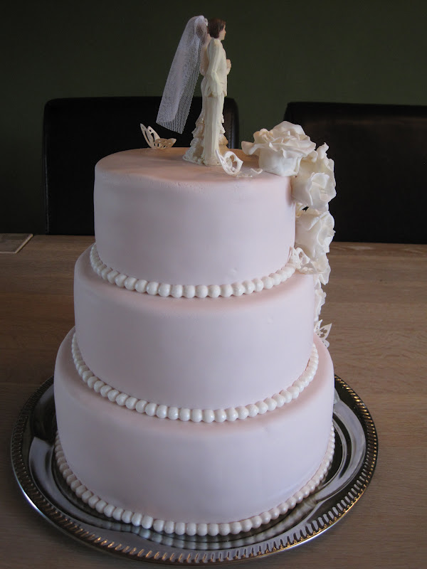 Brudeparret ønskede sig en kage i sart rosa med hvide roser og sommerfugle i et vandfald ned af kagen. Blomsterne og perleborten skulle være med perlemor. De kom så selv med en topfigur til kagen.