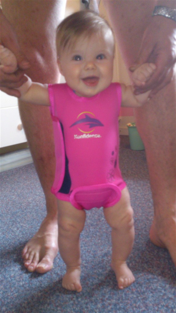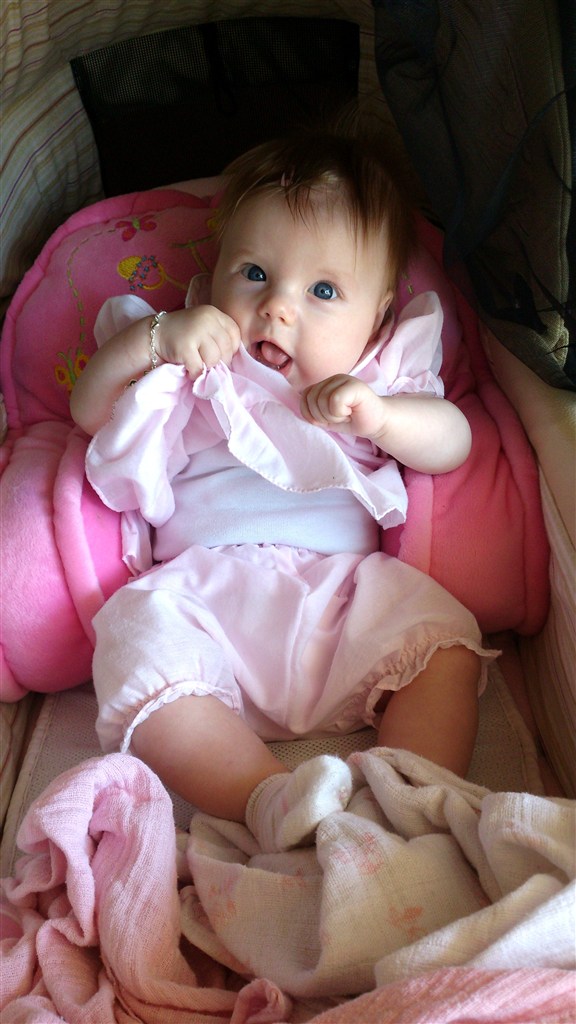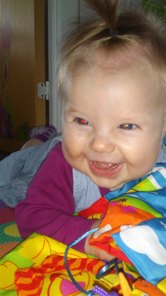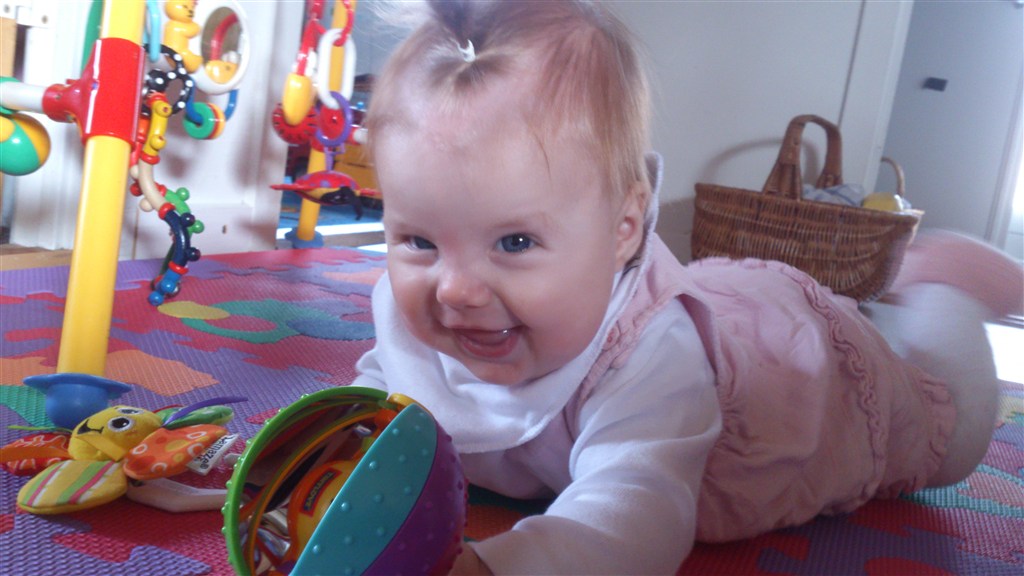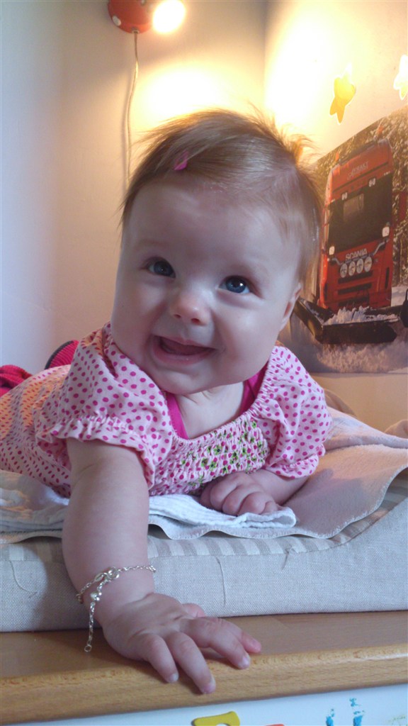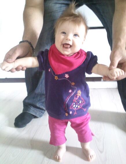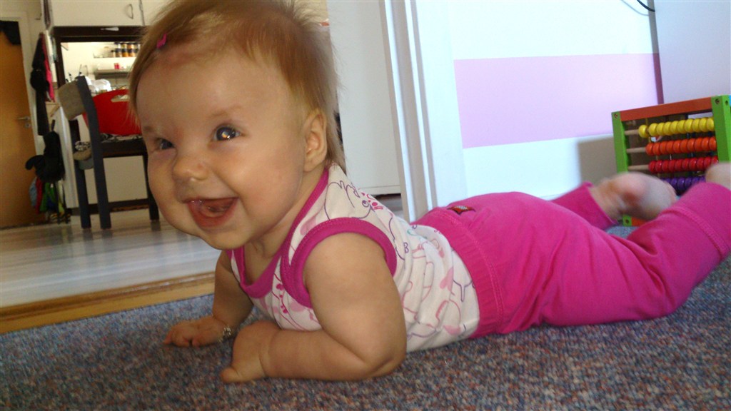 Hun er en skøn lille en med så meget krudt i numsen at selv sp ryster på hovedet... Hun har stået på benene siden hun var 2½ mdr og går med støtte siden hun var 3 mdr. Ruller begge veje - ligger på maven og trækker sig frem - kan hun ikke nå det med hænderne, tager hun da bare med fødderne.