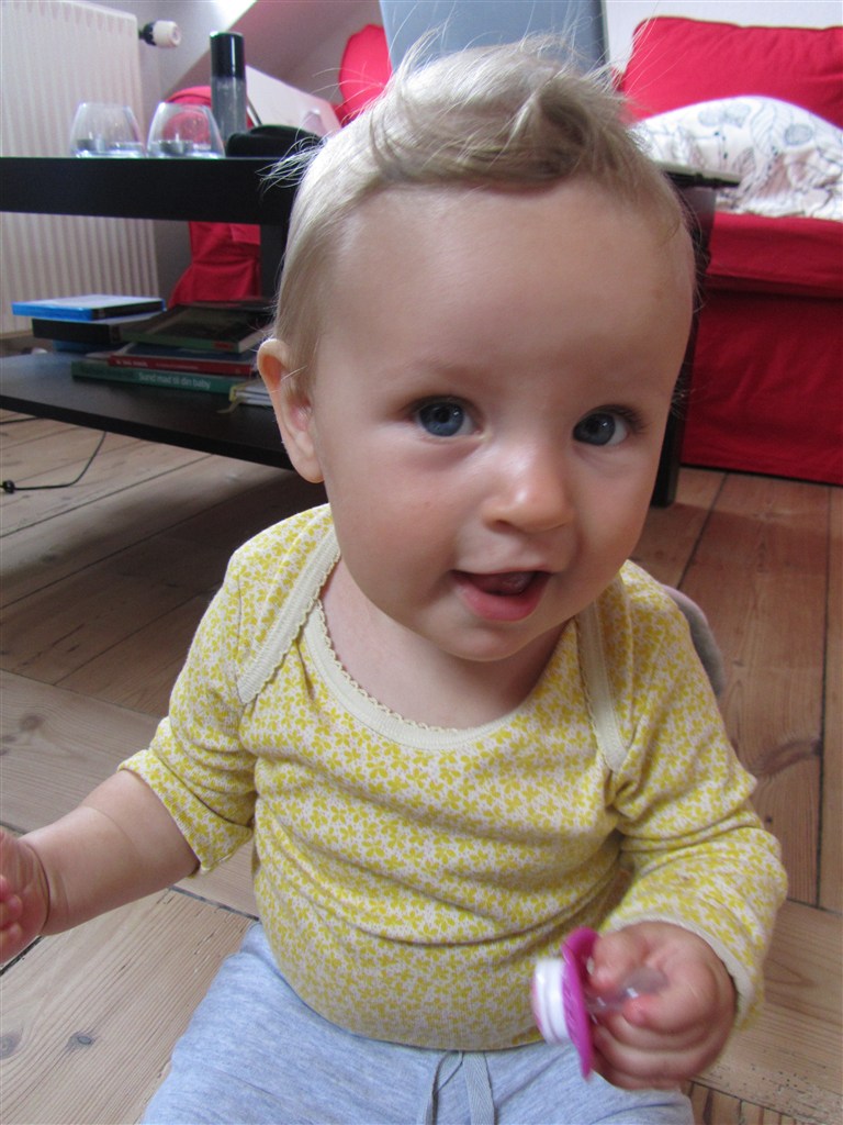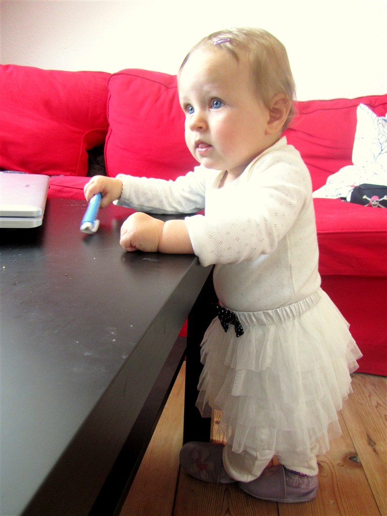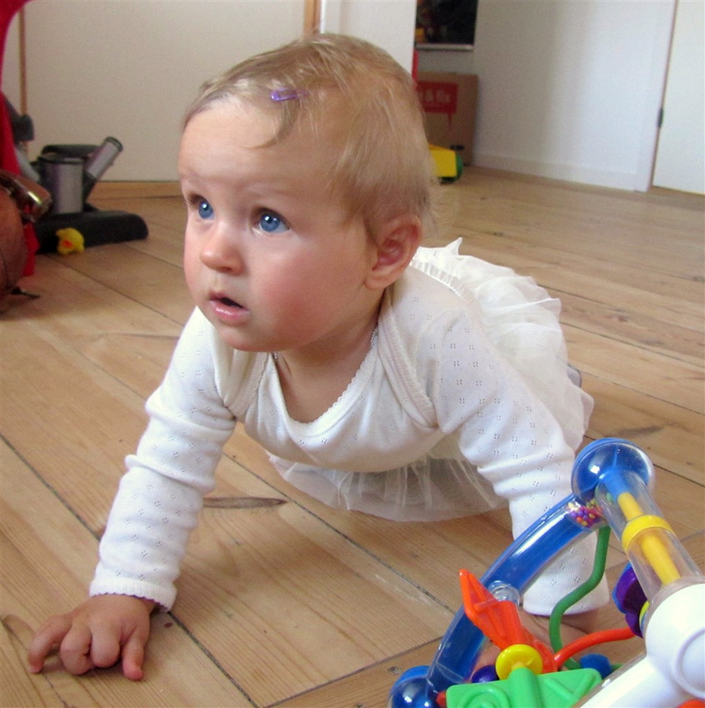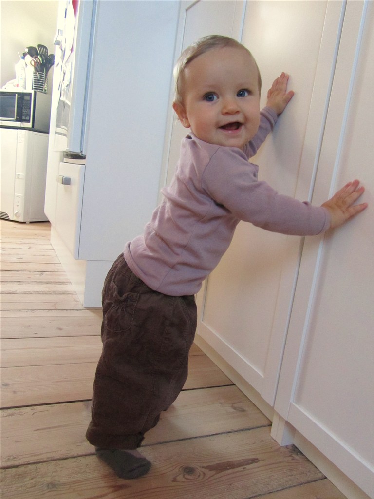 Hun er nysgerrig, og alt skal undersøges. Hun kravler (hurtigt), rejser sig op ad alt og er så småt begyndt at gå langs sofabordet. Så jeg har evigt dårlige nerver
