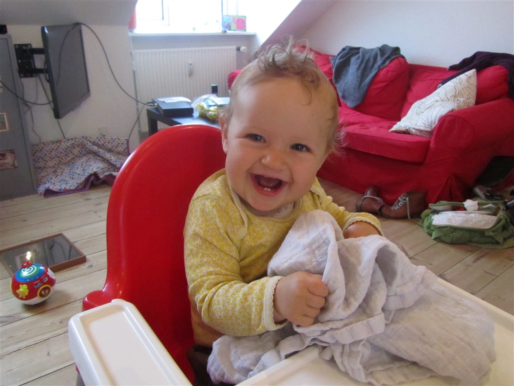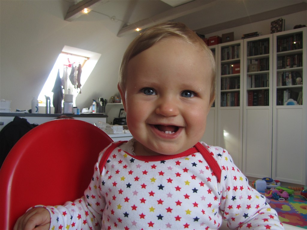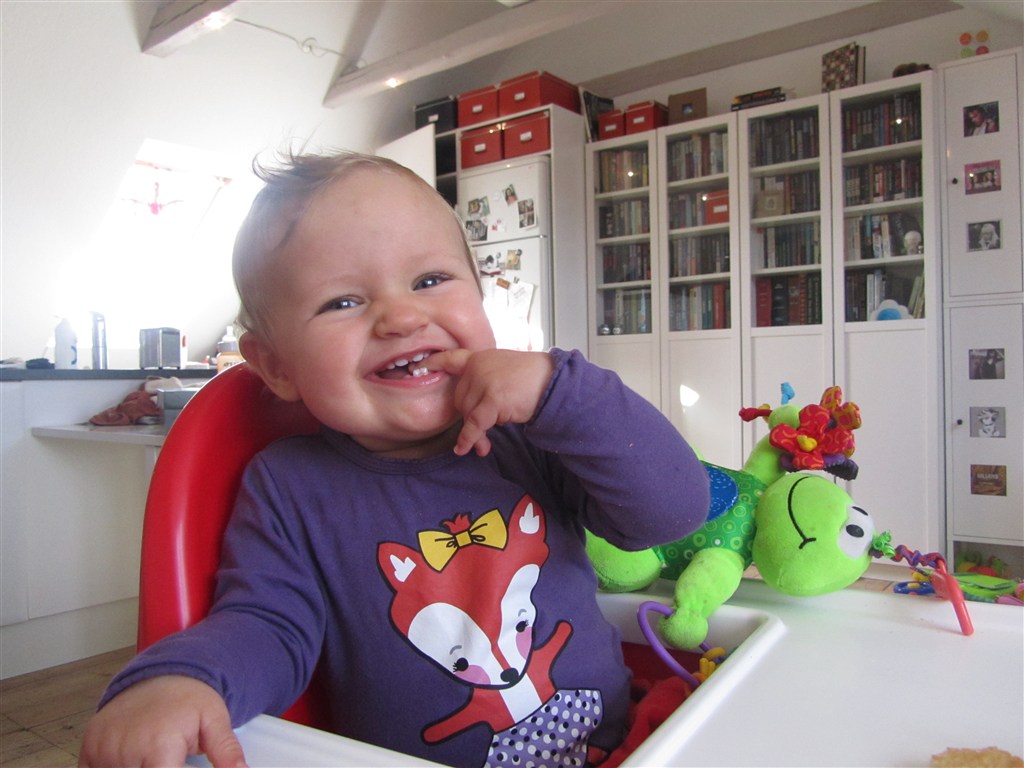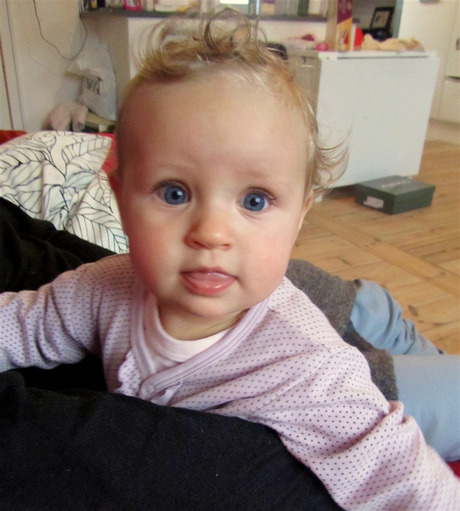 Hun er i dag 10 mdr, og er målt og vejet til 76 cm og 9,6 kg - og så har hun 8 fine tænder