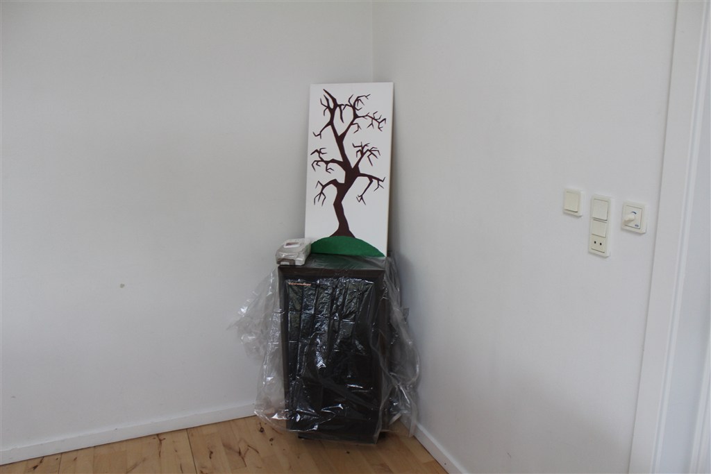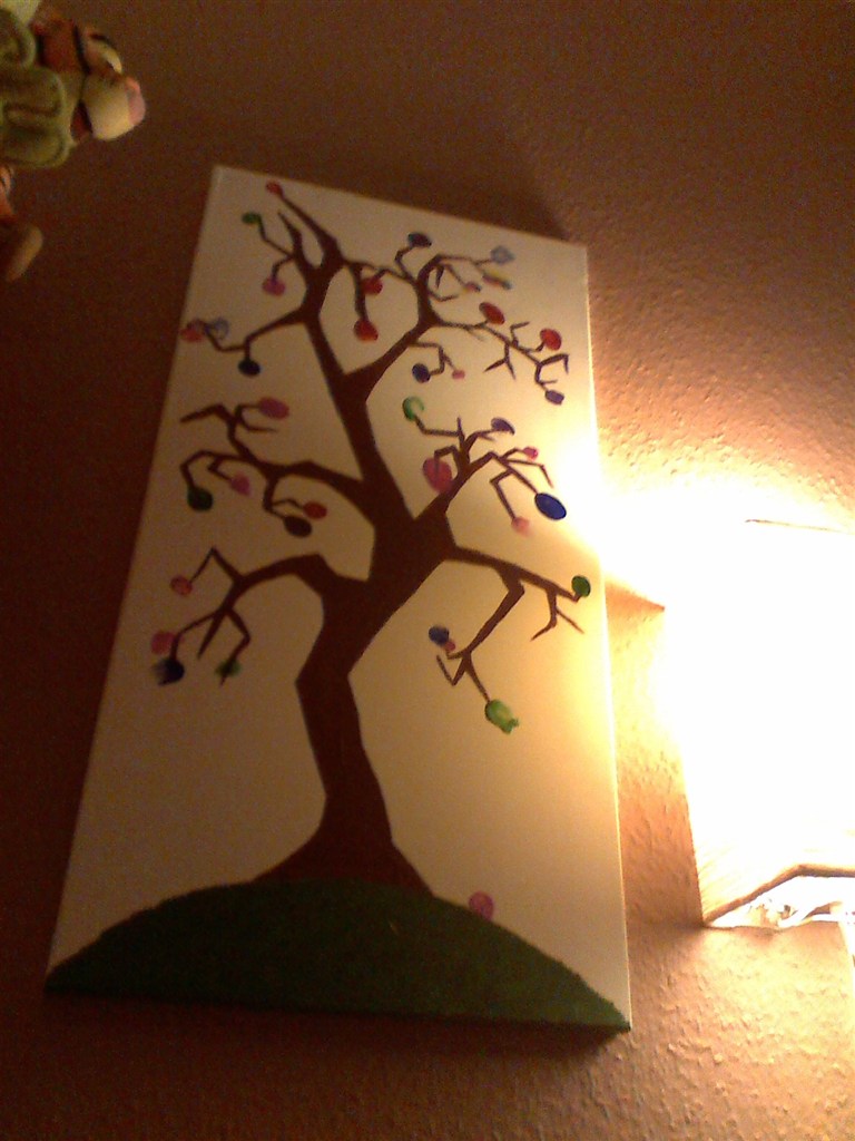 træet i hjørnet er Elnas trolde træ fordi hun er en dejlig trolde unge min mand har malet det og alle gæsterne til festen har sat deres tommelfinger aftryg på og skrevet deres navn på en seddel der nu sidder på bagsiden kan lige taget et billed af det færdige resultat