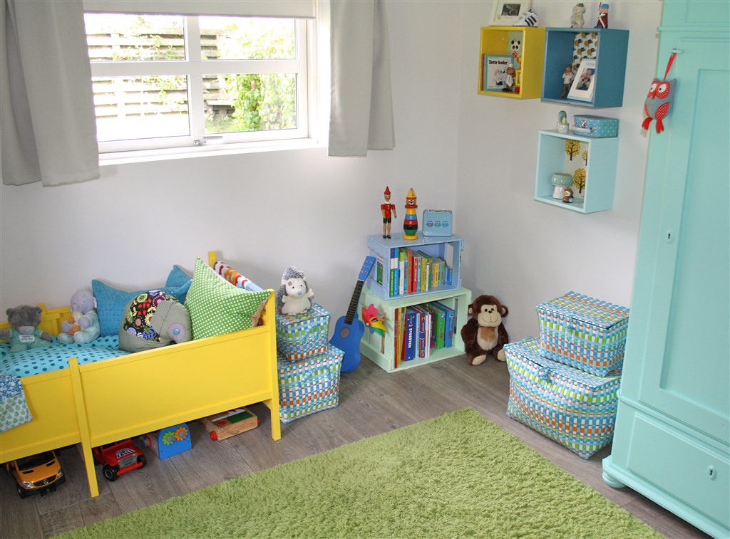Han har de der store "spande" i grøn og blå. Så har vi sorteret biler i én, lego i en anden osv... Fungere rigtig godt
