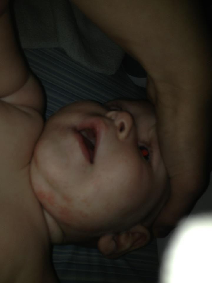 Det ligner kontakt eksem, som min søn også har haft. Jeg fik at vide ved SP at hvis han ikke er genert så skal man se tiden an og evt smørre med salve. Hvad det så ikke forsvinder eller bliver bedre i løbet af 3 dage så ring til lægen og få det tjekket. Phillip har også haft svamp på halsen, da han havde meget hudløshed mellem dellerne. Det ligner det der ikke. Men ring til lægen mandag hvis det ikke er blevet bedre :-) hellere få det tjekket.
