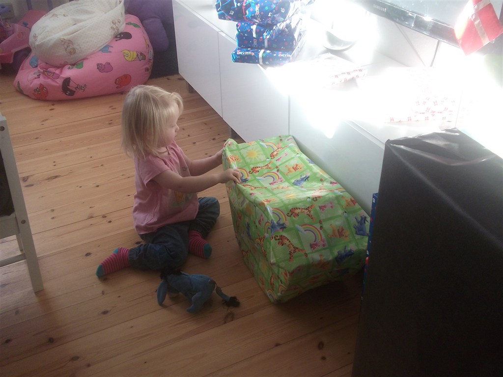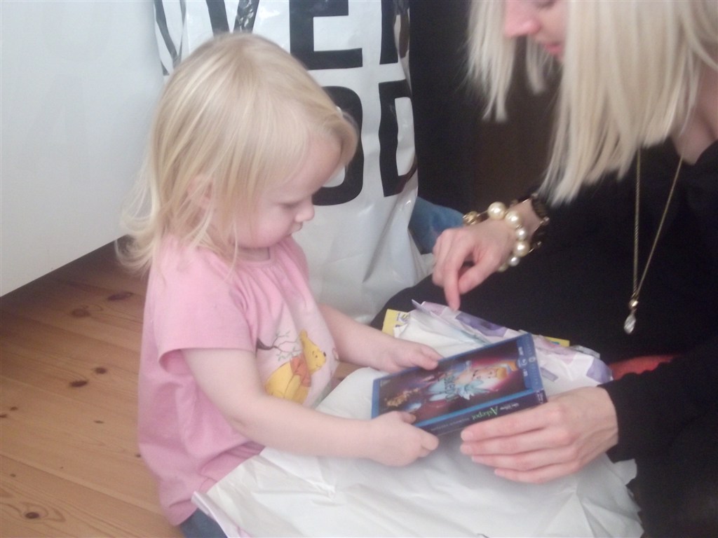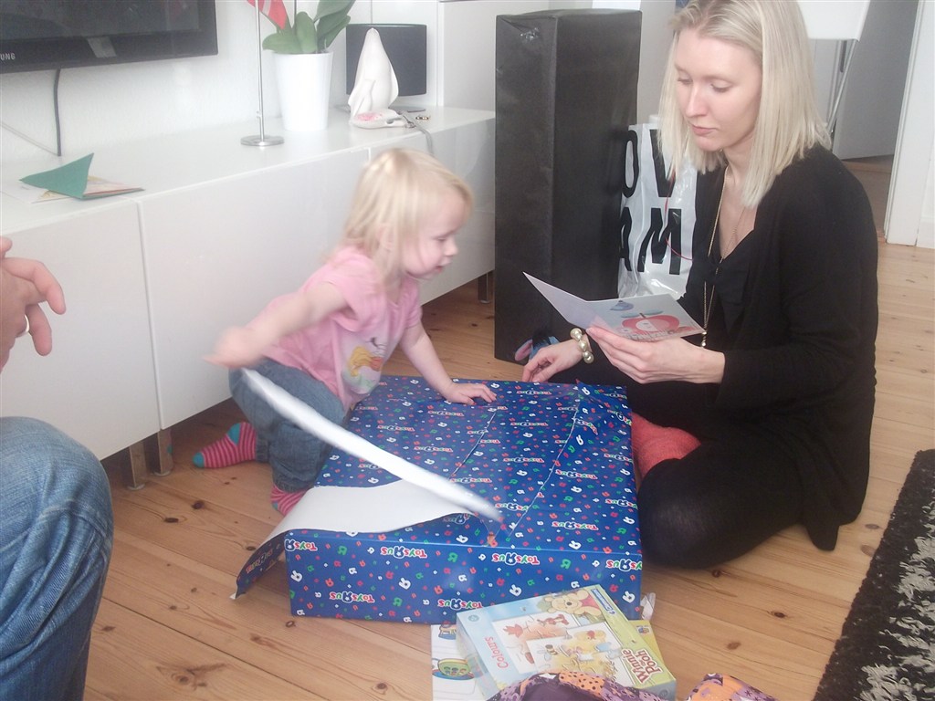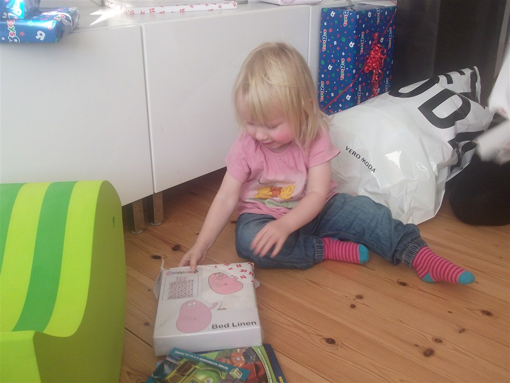 fik hun: bobles hval (af os), 5 x bøger m. Chuggington (af oldefar - jylland), sengetøj (af oldemor), Peter Plys bog (oldemor), 2 x puslespil (af farmor og farfar), billedelotteri (af farmor og farfar), vinterjakke - str. 98 (af farmor og farfar), duplo - zoo(af faster/gudmor), Askepot på dvd (af mandens onkel, tante, 2 x fætre og kusine) og IKEA trækøkken.