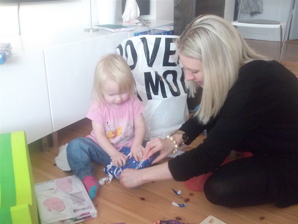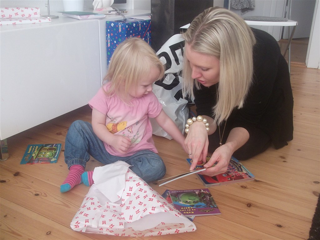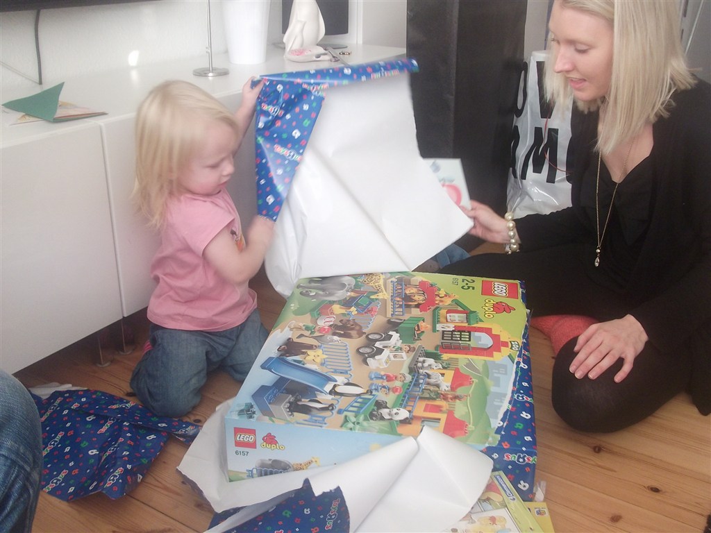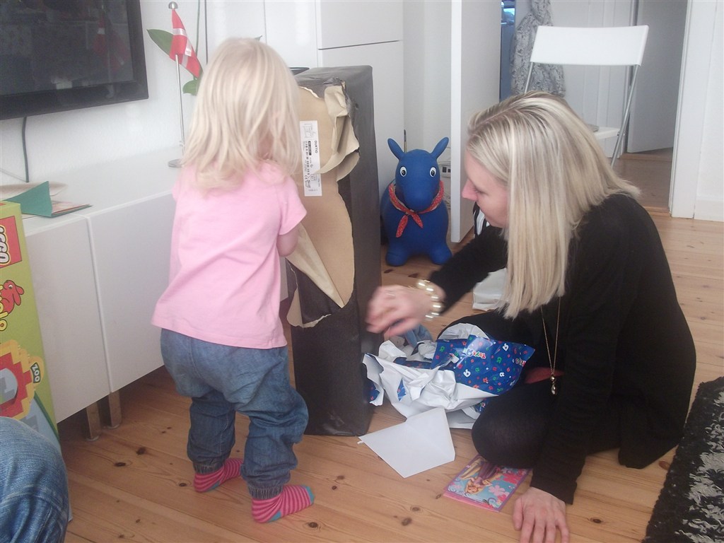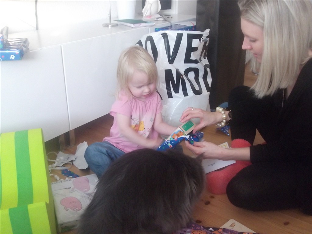 fik hun: bobles hval (af os), 5 x bøger m. Chuggington (af oldefar - jylland), sengetøj (af oldemor), Peter Plys bog (oldemor), 2 x puslespil (af farmor og farfar), billedelotteri (af farmor og farfar), vinterjakke - str. 98 (af farmor og farfar), duplo - zoo(af faster/gudmor), Askepot på dvd (af mandens onkel, tante, 2 x fætre og kusine) og IKEA trækøkken.