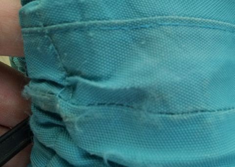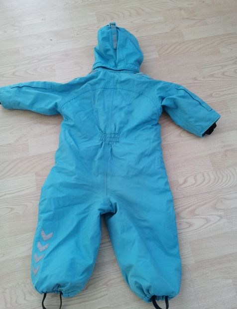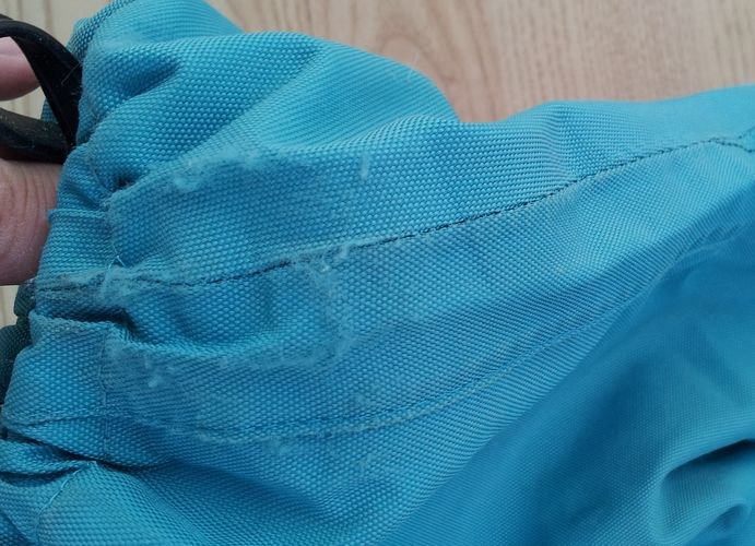Den er brugt og har lidt slid fra velkro på støvlerne som har revet i stoffet men den er stadig 100 % Vandtæt og funktionel og intet slid på knæ eller bag..