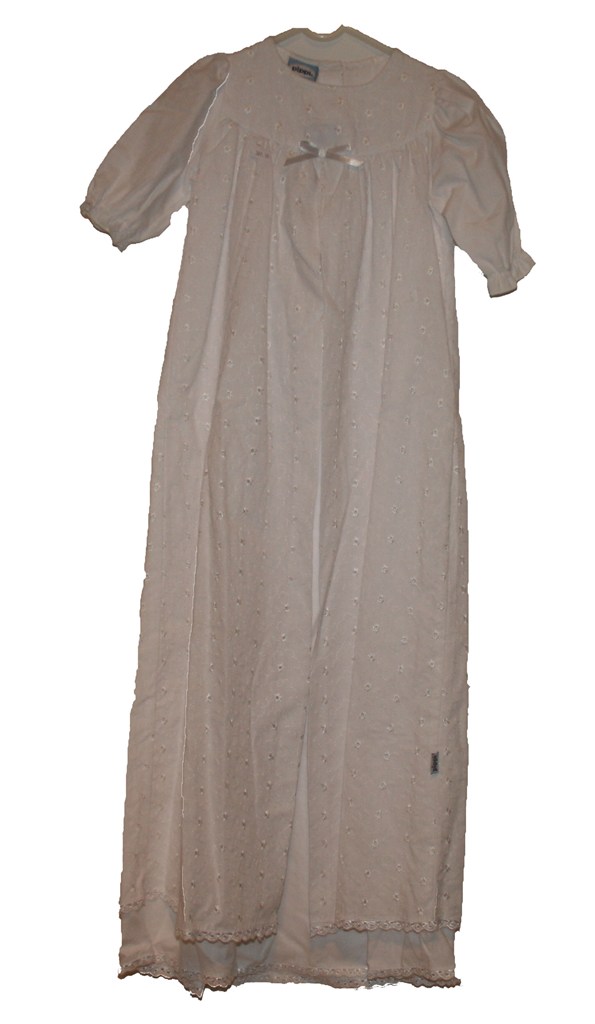 Den yndigste dåbskjole til den lille baby. Kjolen er i to lag, det yderste med allover broderi, inderst i glat bomuld. En virkelig sød kjole med 6 klare knapper på ryggen, rynke effekt samt en sød lille sløjfe ved halsen og flotte blonder på ærmer samt på kjolens nederste kanter. Denne kjole er i onesize hvilket svarer til 3-4 mdr. og er ca. 90 cm lang, dog lidt længere bagpå. 65% Bomuld 35% Polyester Kan maskinevaskes ved 40 grader. Normal butikspris 399,- min pris 199,- + 35,- til emballage og ekspedition, fragten betaler jeg. Der følger en lille gave med til hver dåbskjole. Husk at opgive køn