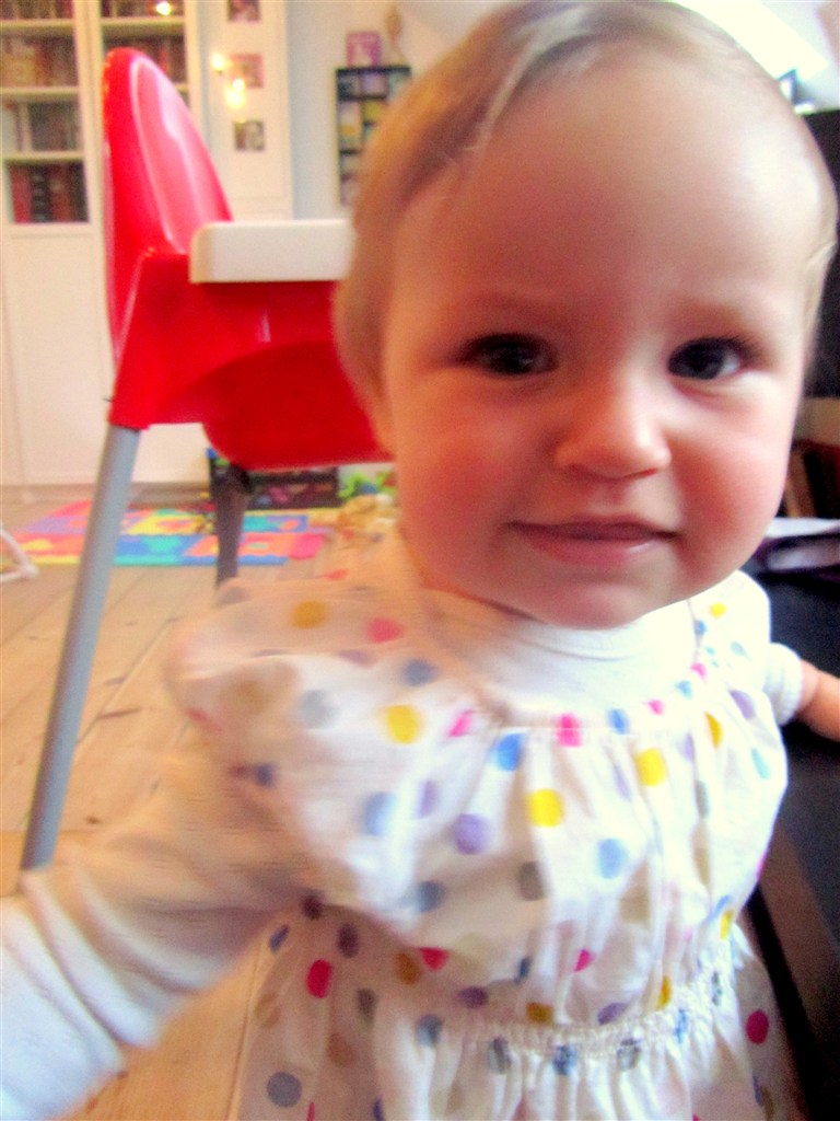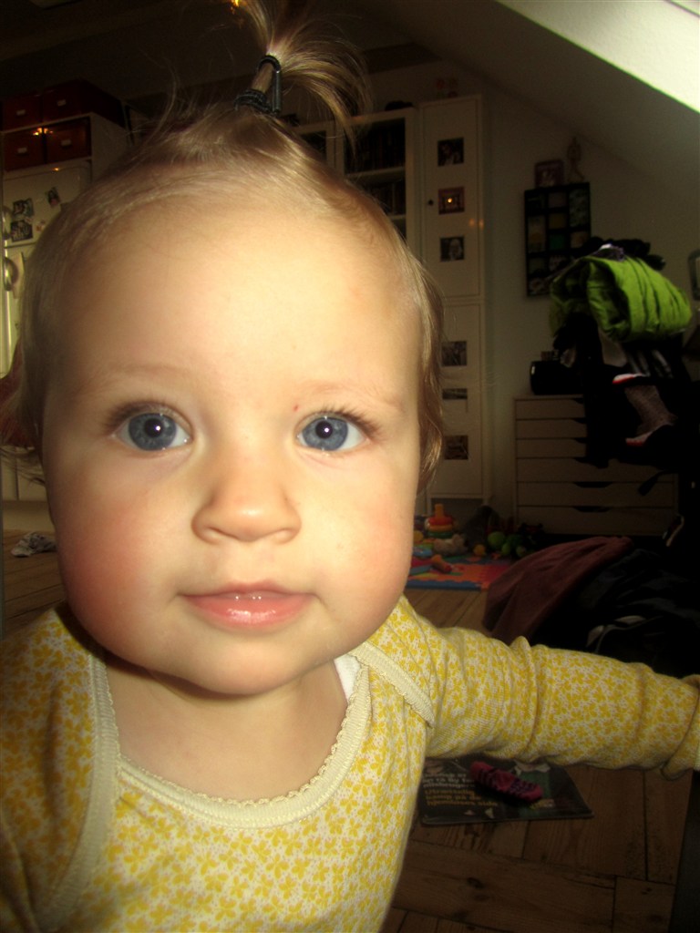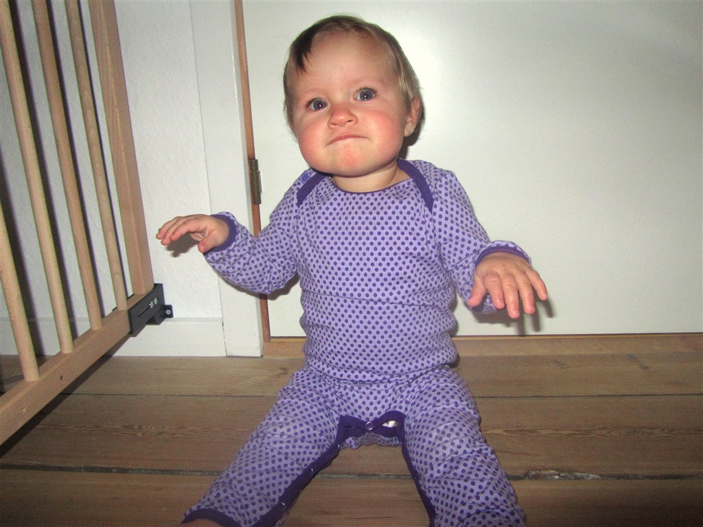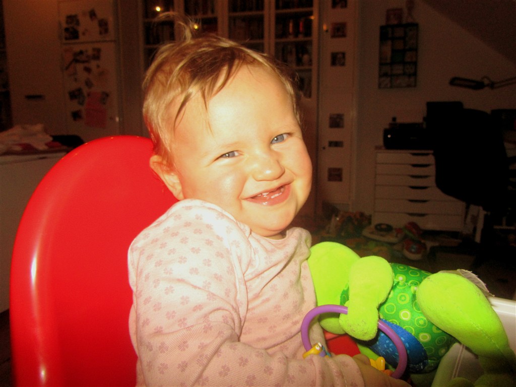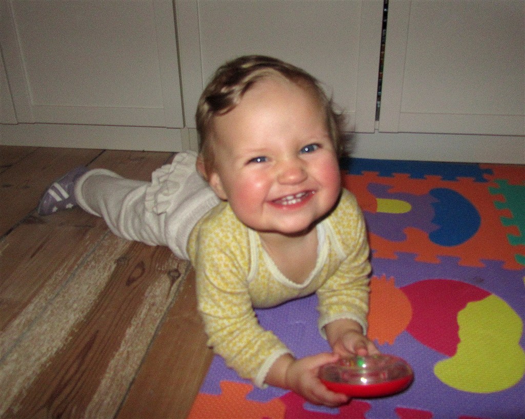 Stadig lige sød og dejlig og meget meget aktiv. Hun kravler stærkt og er overalt. Hun kan godt stå lidt i fri luft men ingen tegn på at hun er parat til at gå endnu - udover hvis hun holder ved noget.