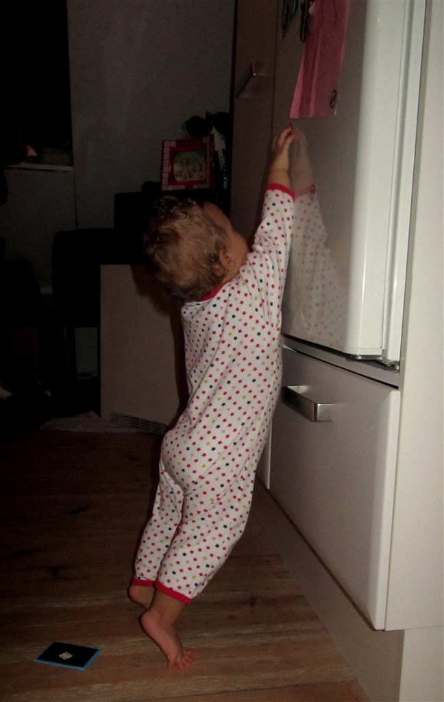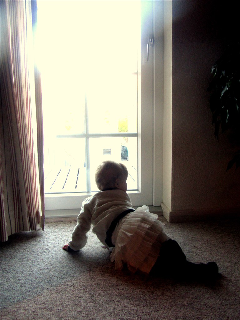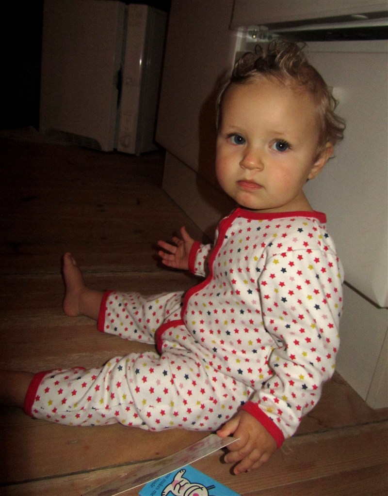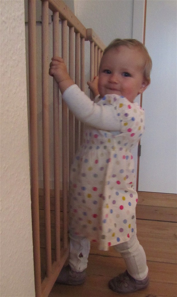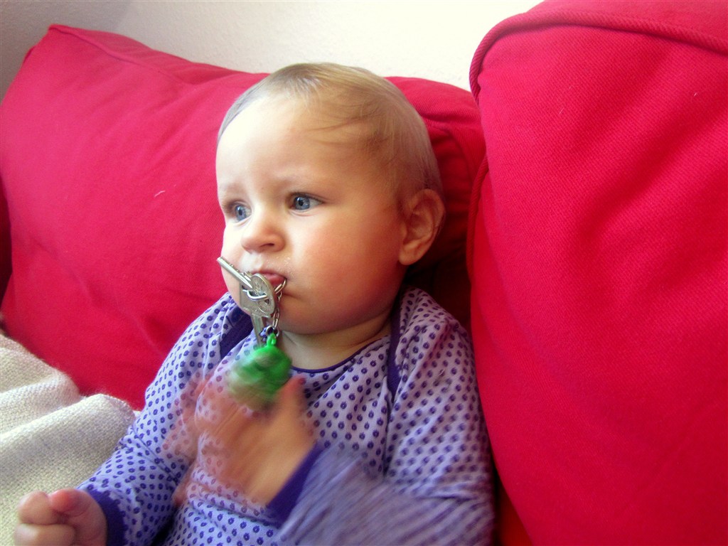 Stadig lige sød og dejlig og meget meget aktiv. Hun kravler stærkt og er overalt. Hun kan godt stå lidt i fri luft men ingen tegn på at hun er parat til at gå endnu - udover hvis hun holder ved noget.
