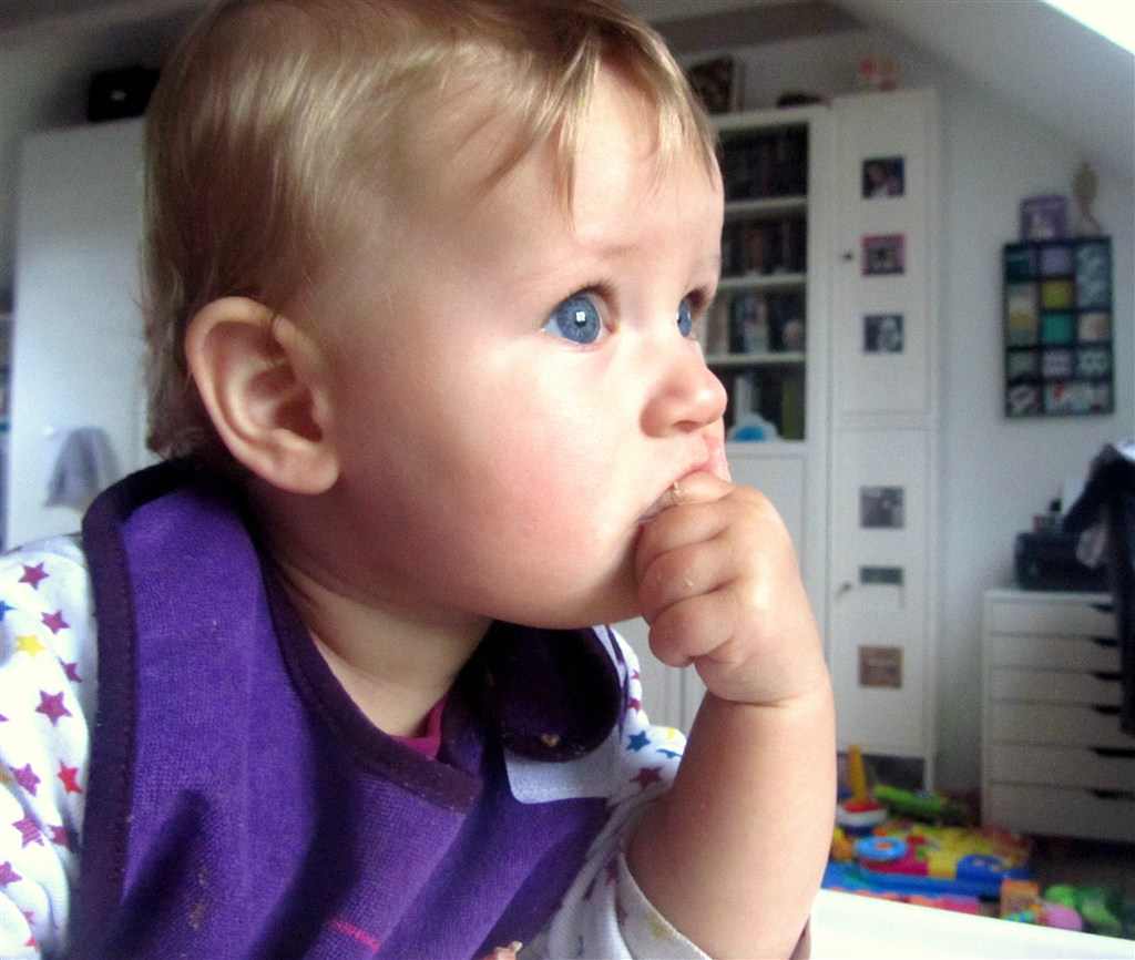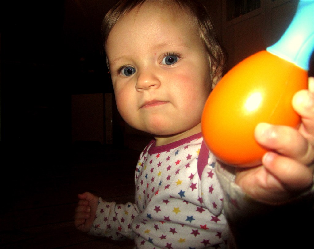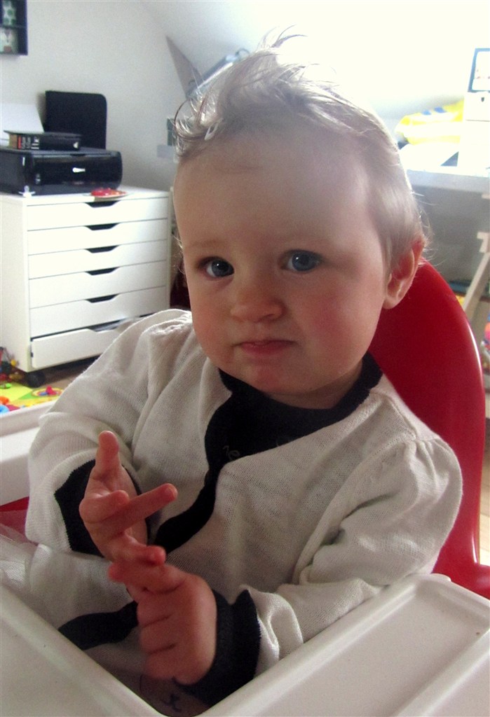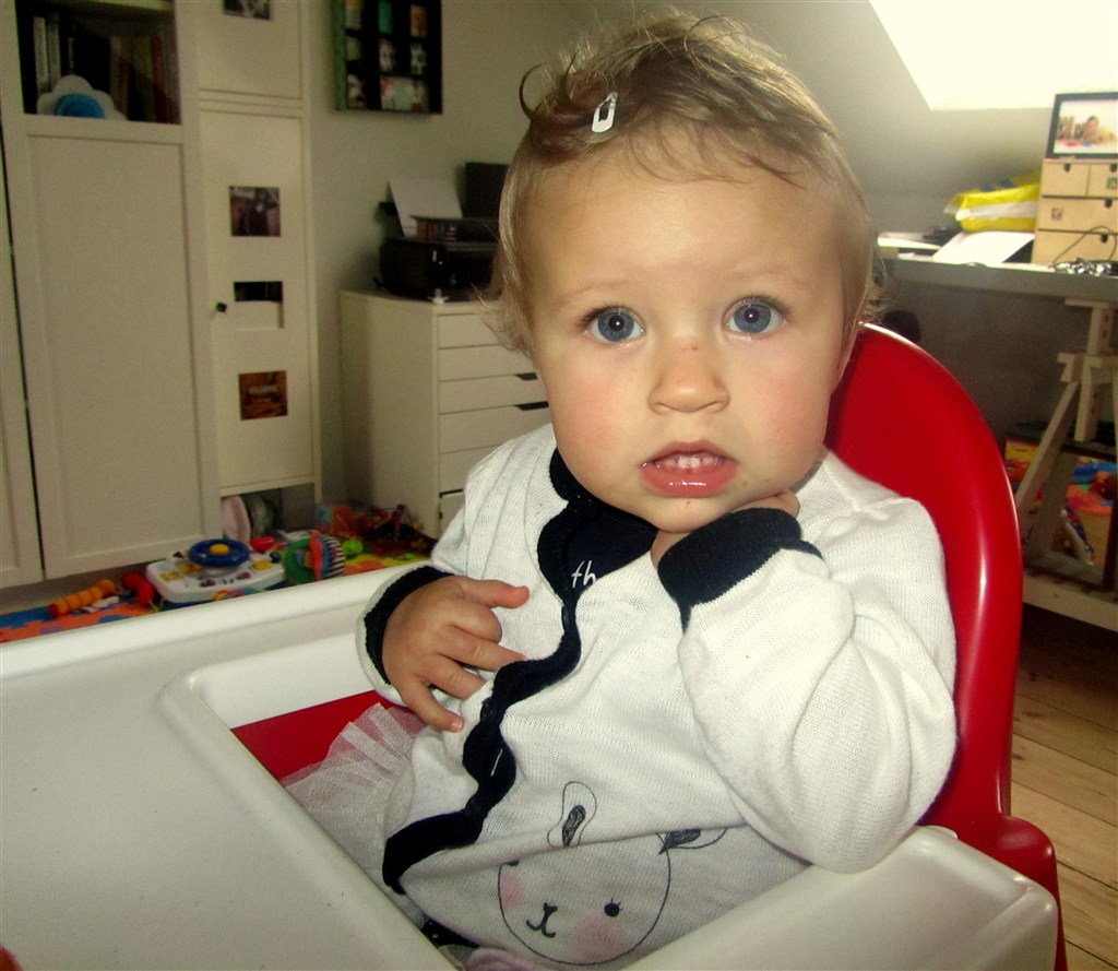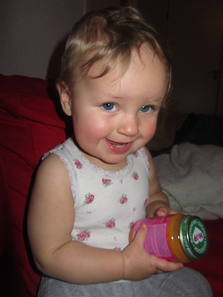 Til gengæld har hun meget fokus på sproget, og kan efterhånden sige flere ord meget tydligt; 'hej', 'mor', 'mad', 'mer' 'op' og 'baby' (når hun ser sig selv i spejlet)