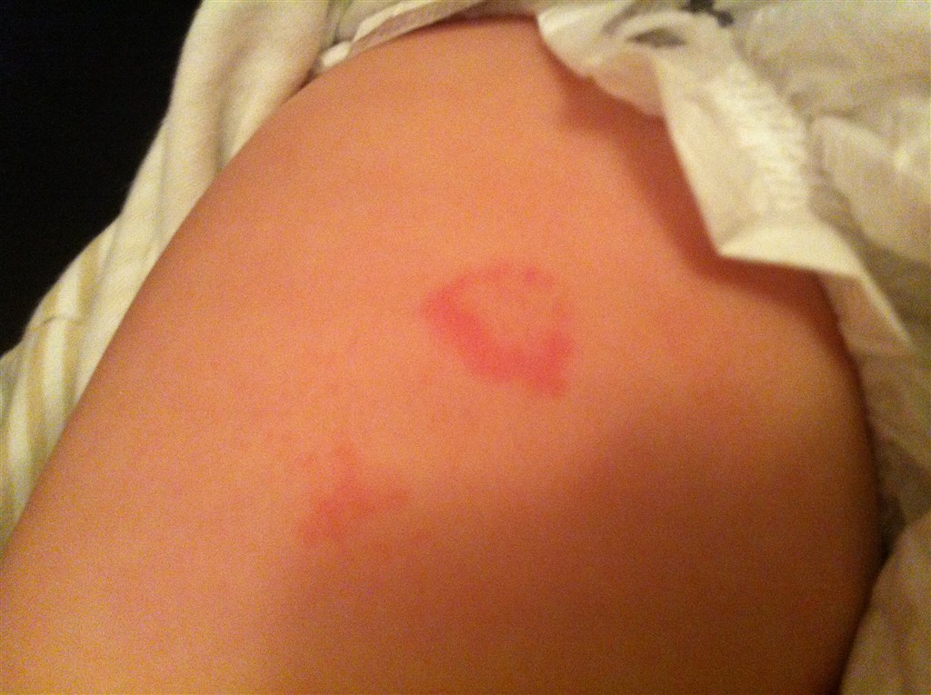 Men her til aften opdager jeg det her udslæt på hans lår, og det er også på det andet lår, der er lidt mere på det andet lår, bare mere utydeligt.