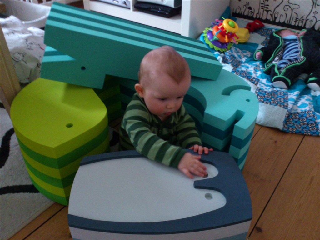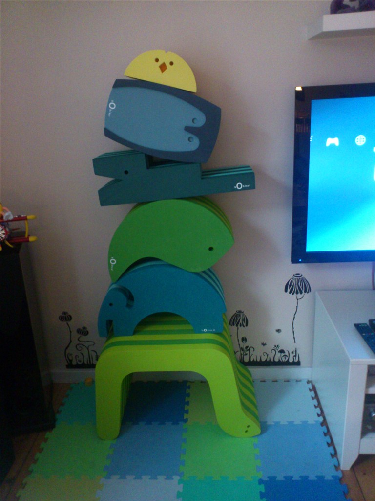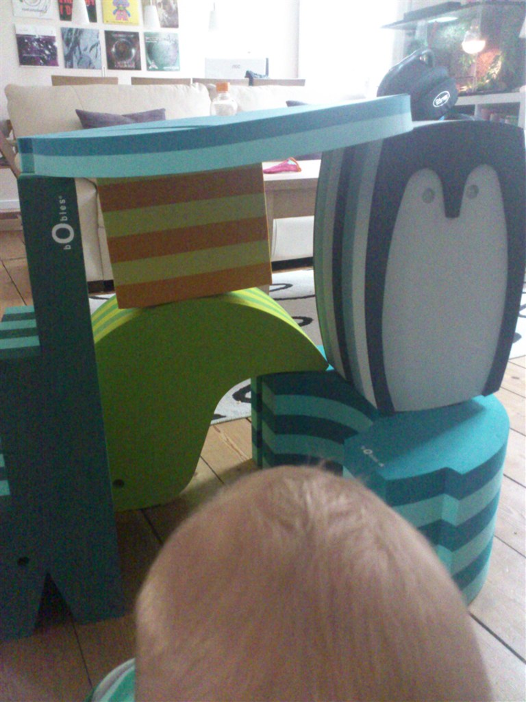 Vi har elefant, to krokodiller ( så man kan gå op af trappen også ned igen ) og den store myresluger. Felix på 2 år bruger myreslugeren til bord og stol i stuen, passer lige til kiks og et glas mælk, han bygger dem ovenpå hinanden, de bruges til tunnel for biler og tog - også er de selvfølgelig en del af balance bane