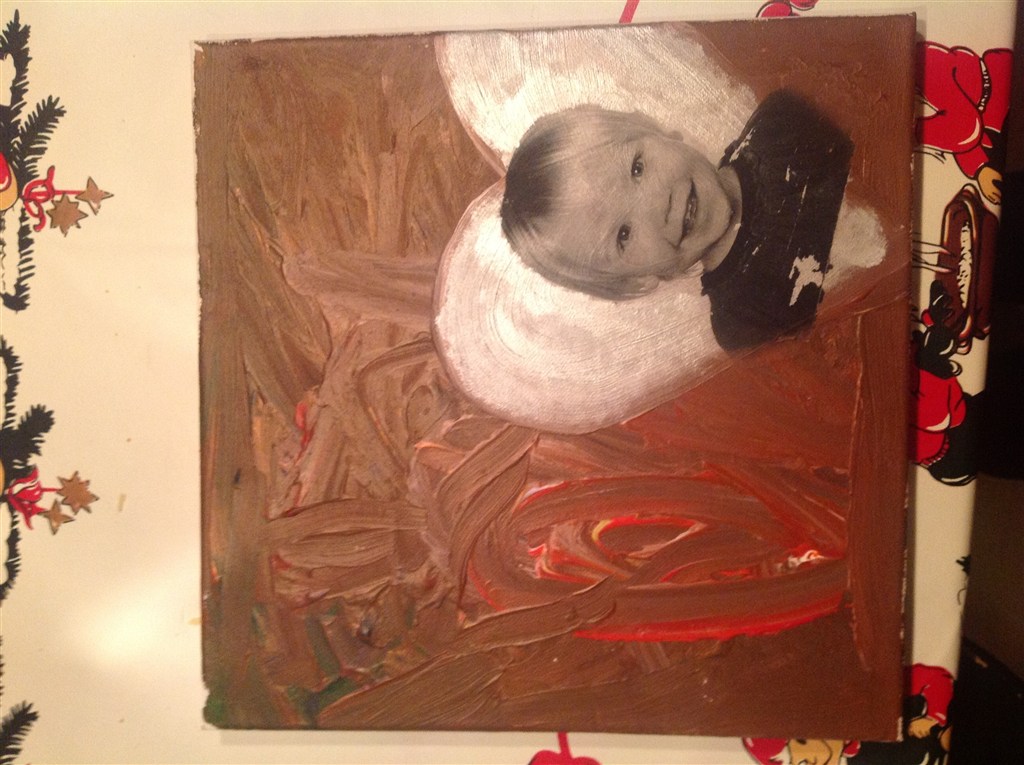 Lilje har lavet julegave, hun har malet på 6 lærreder, som jeg hurtigt efter lige glattede ud, senere malede over, og nu har jeg på de 2 af dem overført billeder af banditten.