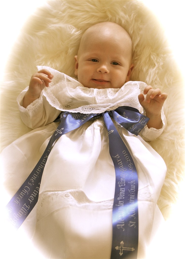 Min søn er døbt i sin oldemors dåbskjole, som hun for snart 74 år siden var den første til at bære på hendes dåbsdag. Dåbskjolen er syet af hendes mosters brudeundertøj og efterfølgende blev hendes (oldemors) to børn (den ene Alexanders farmor) også døbt i den. Dåbskjolen gik i arv til farmor, som har fået hendes fem børn døbt i den (det ene barn er Alexanders far). Her efter blev Alexander så døbt i den og i år blev hans lille kusine også døbt i den.