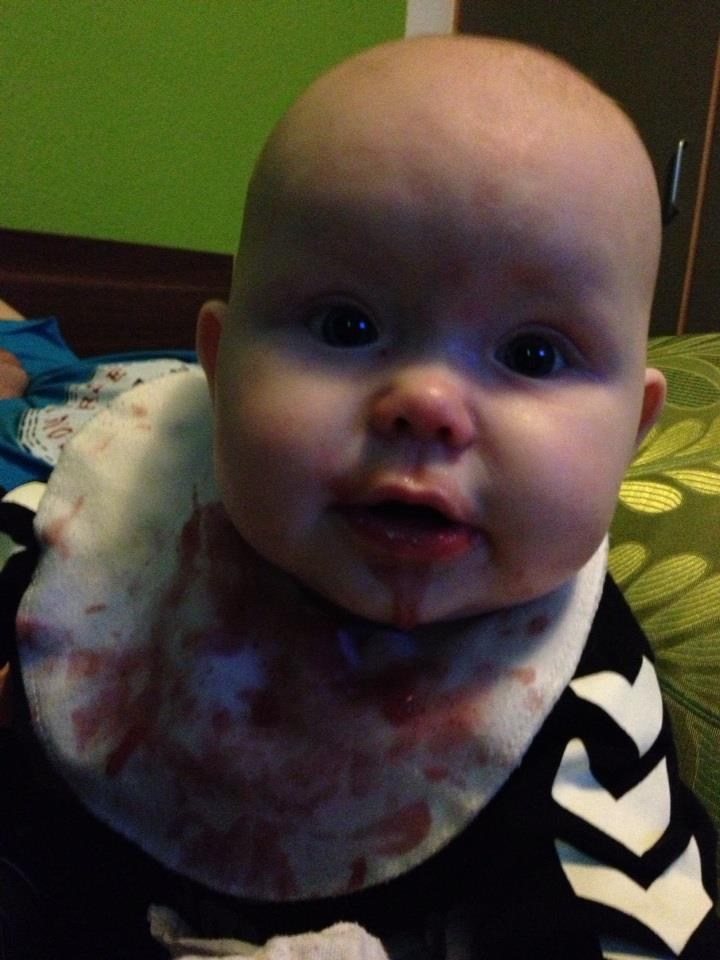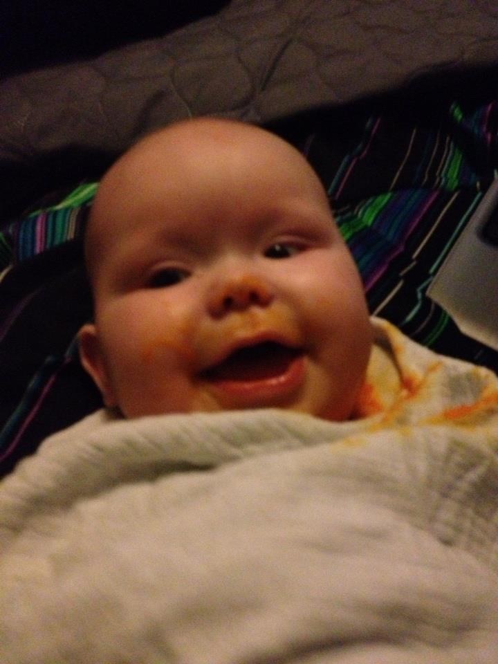 Vi startede lidt mildt med gulerodsmos og lidt jordbærgrød