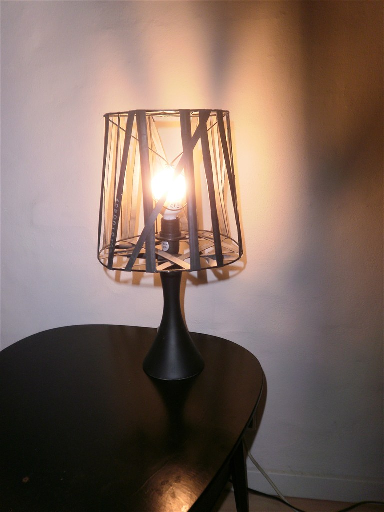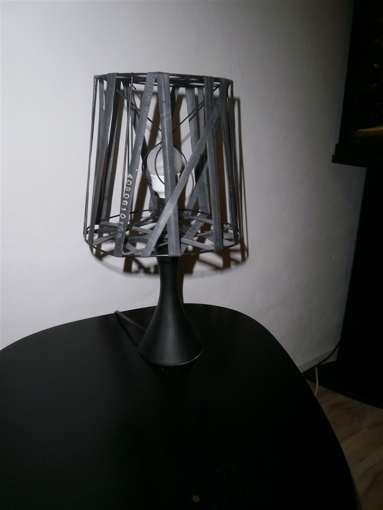 Lampen er lavet med gamle opklippede cykelslanger der er viklet rundt om skelettet fra en lampeskærm, ved stadig ikke helt hvad jeg selv sys om resultatet så glæder mig til lidt respons på denne..