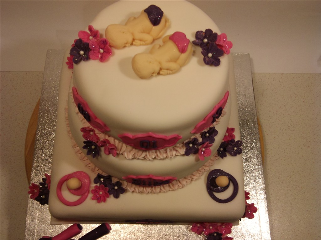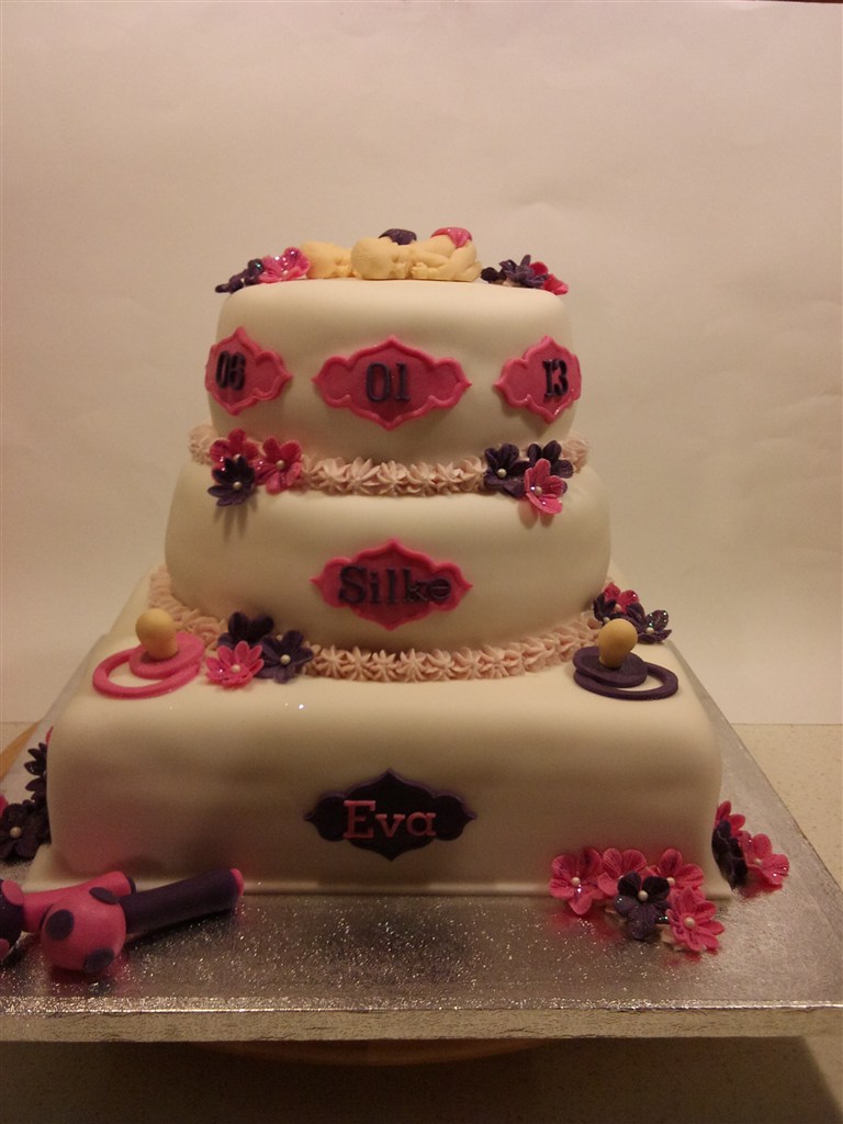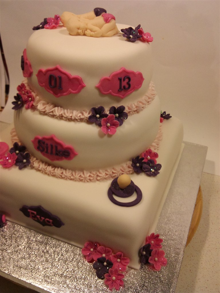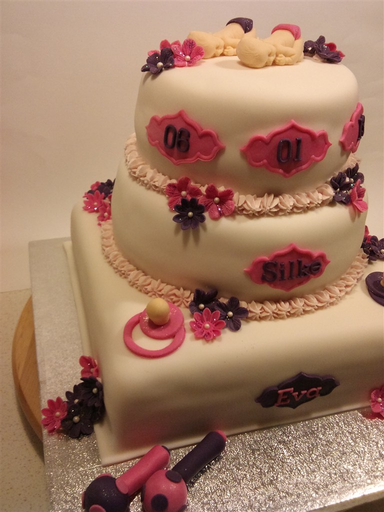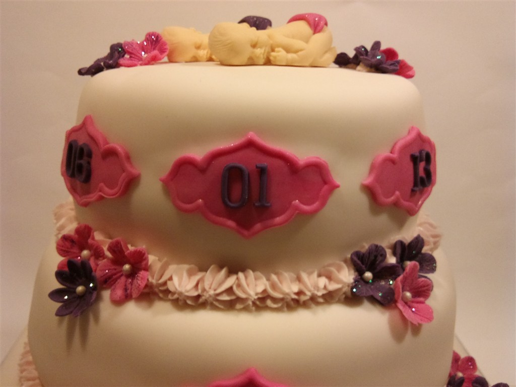 Så her i weekenden lavede jeg den sidste kage til en dåb af to piger. Den skulle være hvid, pink og lilla og gerne med masser af glimmer - så sådan blev det