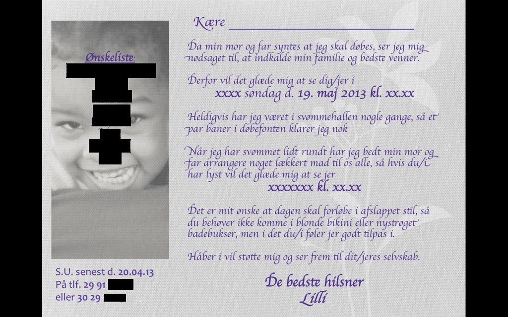 Ønskeliste er vi heller ikke helt sikker på hvad der skal stå endnu, og billedet kommer til at være af vores lille skat. også kommer det til at være på et "papkort" der kan åbnes med en form for forside på