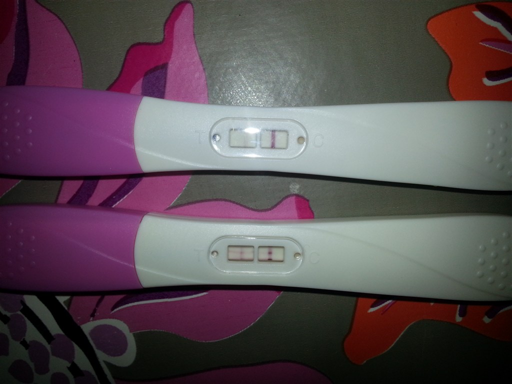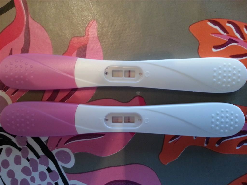 Og ja jeg er i chokmode og rundt på gulvet efter testen viste positiv. Den første (den øverste test) utydlige streg kom indenfor 5 min, den anden stav efter lidt over 5 min (kunne ikke tisse så meget mere), bare den ene streg kom først lidt over 4 min!