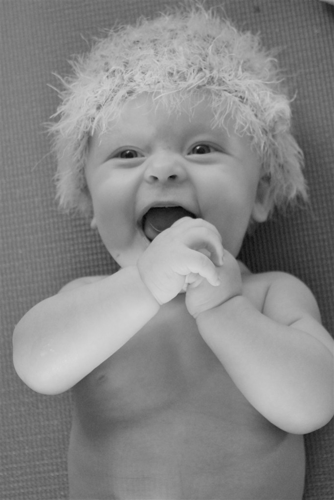 Griner! Hvor ser han bare sød ud! Er vild med det aller sidste billede... Den hat der... det ligner hår!! hihi