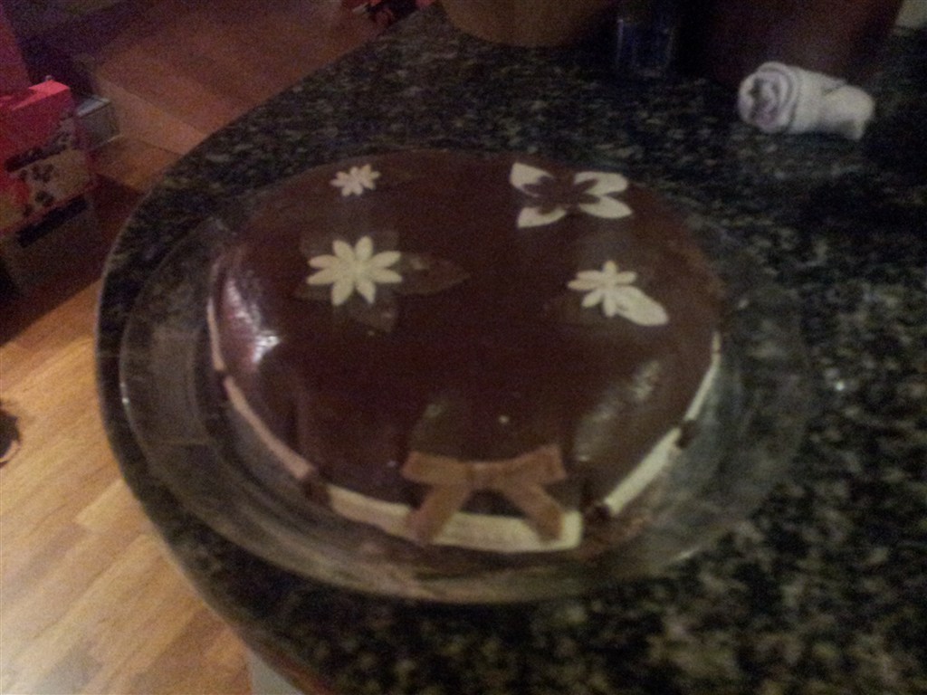 Så lavede min søster og jeg lige en lille kage til manden:-) Elsker min nye knappe og bånd "maskine" :-) Kan ikke huske hvad det hedder:-)Det er en kage med chokolade og æble med choko musse :-)