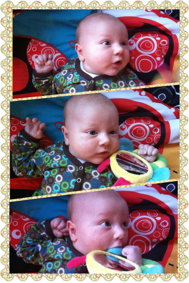 Han er begyndt at smile og grine med lyd, og han er meget meget opmærksom på sine omgivelser.