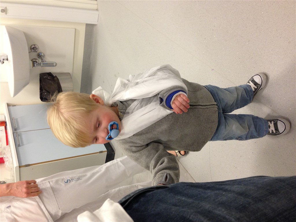 Så viser han mig sin arm og puster på den..... og efter der hænger den bare ned langs siden og han vil slet ikke bruge den!! Så si'r jeg til min mand at der måtte være noget galt og alligevel er vi usikre for han er hverken faldet eller noget.....