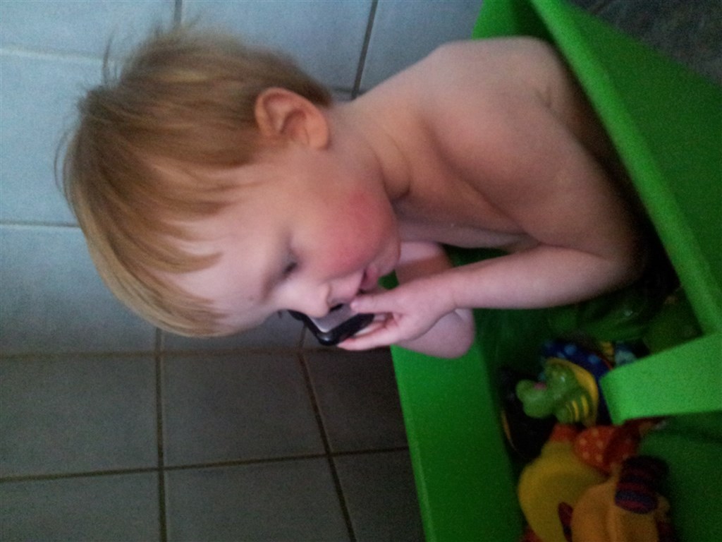 Elias hygger sig i sit morgen bad med tlf og det hele:-)Har i nogle hygge billeder?