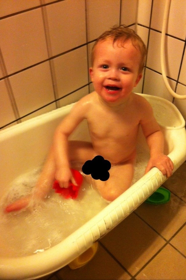 Benjamins'mor skriver: Dette er en af de første gange han nyder at være i bad, og ikke skriger.