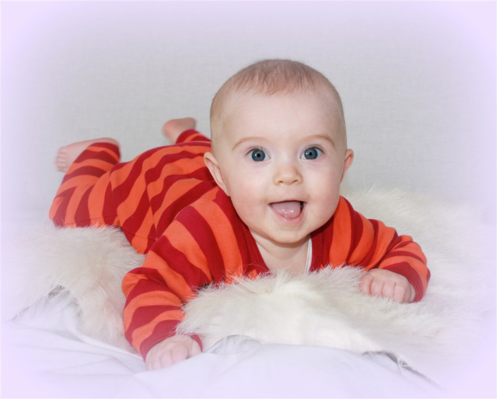 Tiger er stadig mild, skøn og altid smilende! Hun lære så meget og er så dygtig! Triller både den ene og den anden vej, sidder selv og er nu også begyndt på grød. Hun blev fuldt amme til hun var 5 mdr. og 25 dage