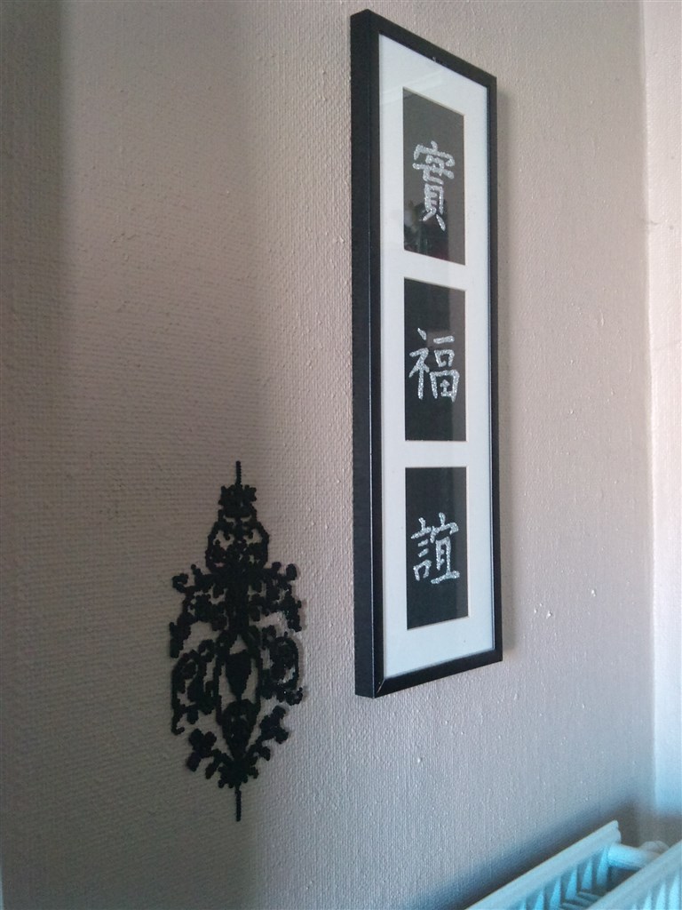 Jeg fik lavet et rigtigt flot mønster - synes jeg selv - men det gik desværre galt, da det skulle stryges. Bagepapiret blev elektrisk og løftede flere perler fra pladen, og jeg HAVDE allerede strøget lidt, så det blev noget rod. Jeg fik det dog reddet nogenlunde, så det hænger på væggen nu og "pynter"