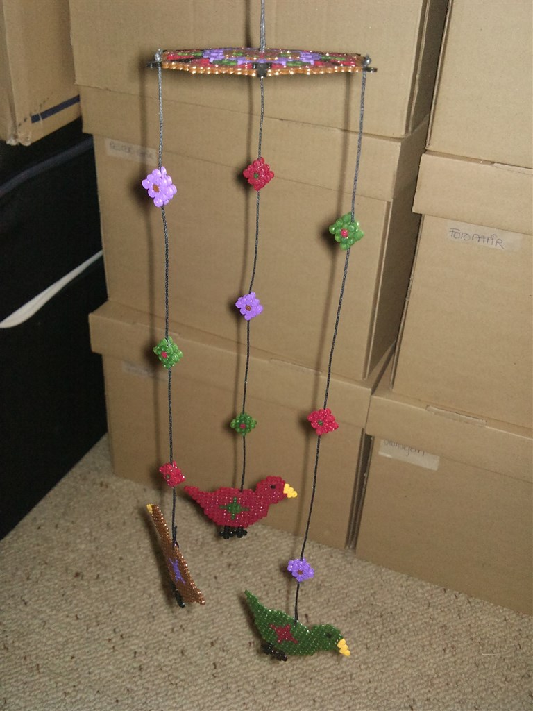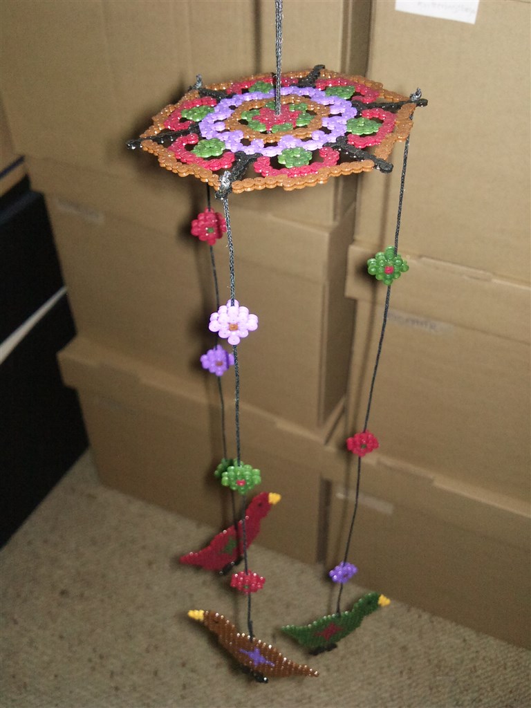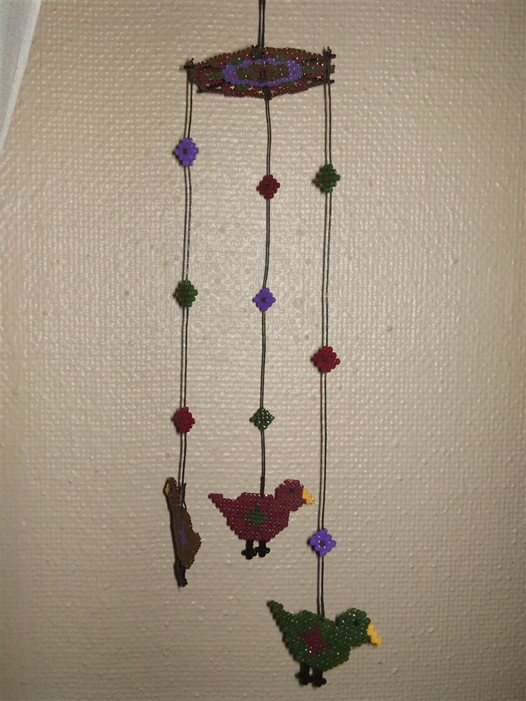 Så ville jeg prøve at lave et træ med en fugl, det gik ok, synes jeg. I dag har jeg så lavet en uro med fugle og "blomster", håber I kan få fornemmelsen af resultatet på billederne