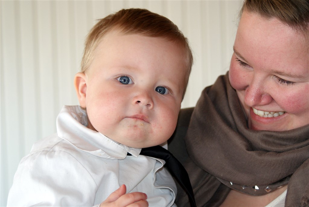 Han er dejlig, billedet er taget i søndags, da vi var til barnedåb, han havde de brune klapbukser på at du har syet til ham. Elsker de bukser til ham og han skal snart have et nyt par, så du kan godt gøre klar