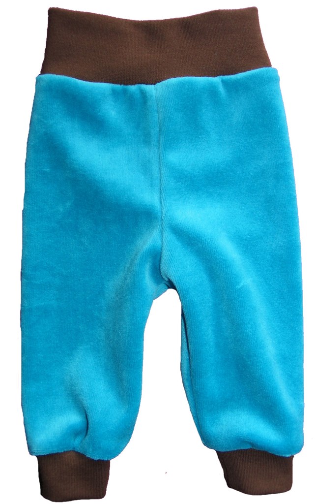 De andre bukser, dem på det nederste billede, er turkis velour med brun rib.